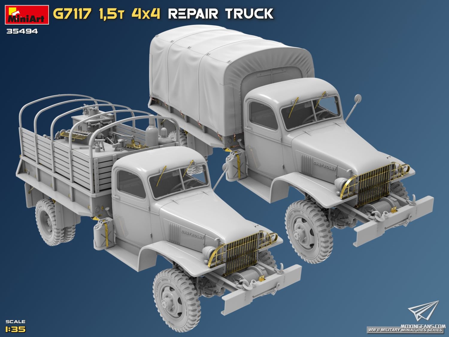 MINIART预告了一款新品:1/35比例的G7117 1.5t 4×4维修卡车。从介绍来看这款新品附带蚀刻片,大量维修工具和车棚,上市时间未公布。