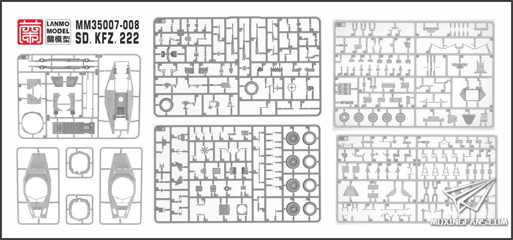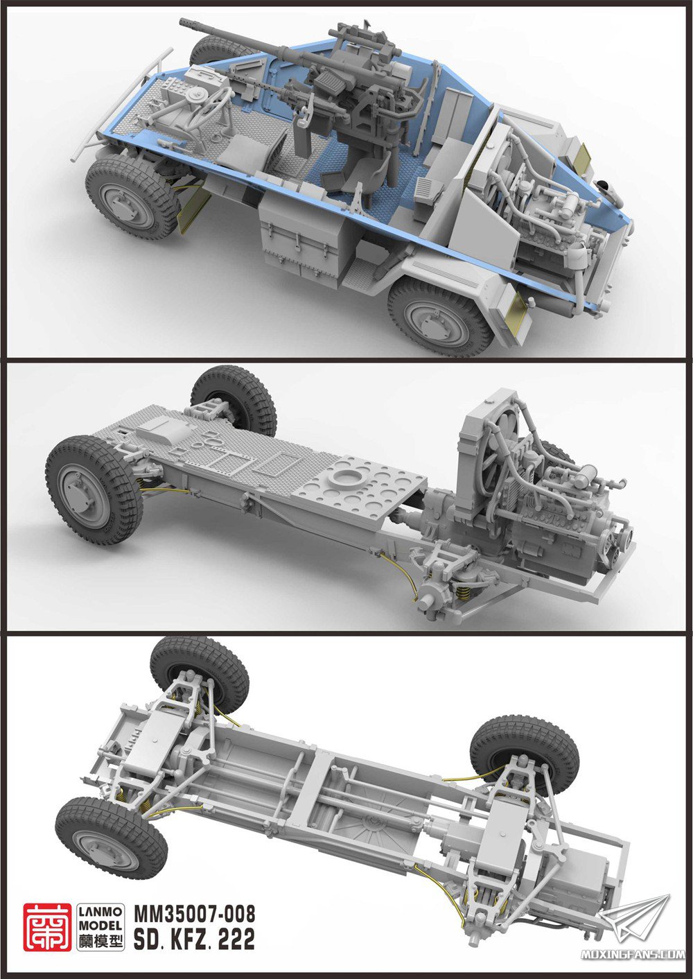 蘭模型的222装甲车装甲车有新消息了,这次发布的共2款,分别是德国早期型和中国型,厂家介绍如下: 全新sd.kfz.222 装甲车进行更为精细的考证及细节: 1,完善发动机及变速箱系统,包括早中期和晚期的不同区别介绍。 2,活动悬挂系统区别,以及早中期A型底盘和晚期B型底盘区别。 3,包括区别于晚期的左侧扭杆系统。并且还原车身框架系统分离。 4,增加了活动炮架及脚踏开火系统,全活动舱门,活动悬挂。 5,对各种版本的车体进行了更细节的考证。(参考NUTS BOLTS 47 超级经典的考证书籍,建议购买) 6,包括对二战中国陆军版详细车体及外部迷彩考证(在此感谢来自澳门的曾健國先生的资料以及书籍:中国武侑圖誌) 7,并且会继续采用非免胶但分色板件。 8,可能预计12月份现货上市!