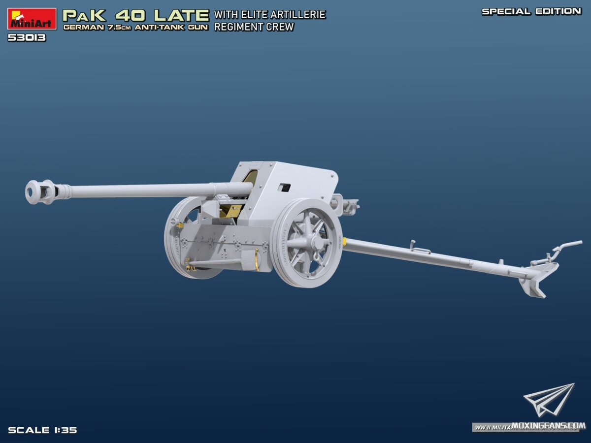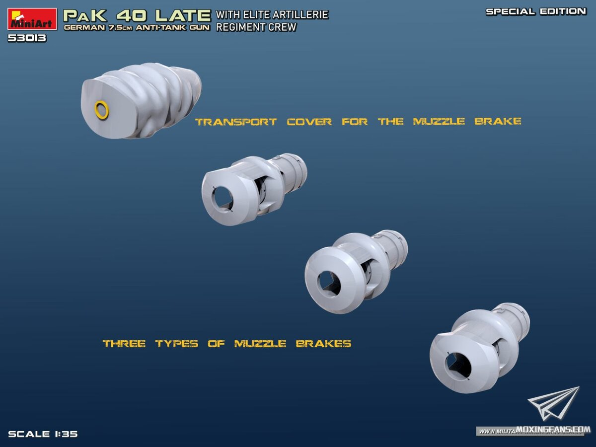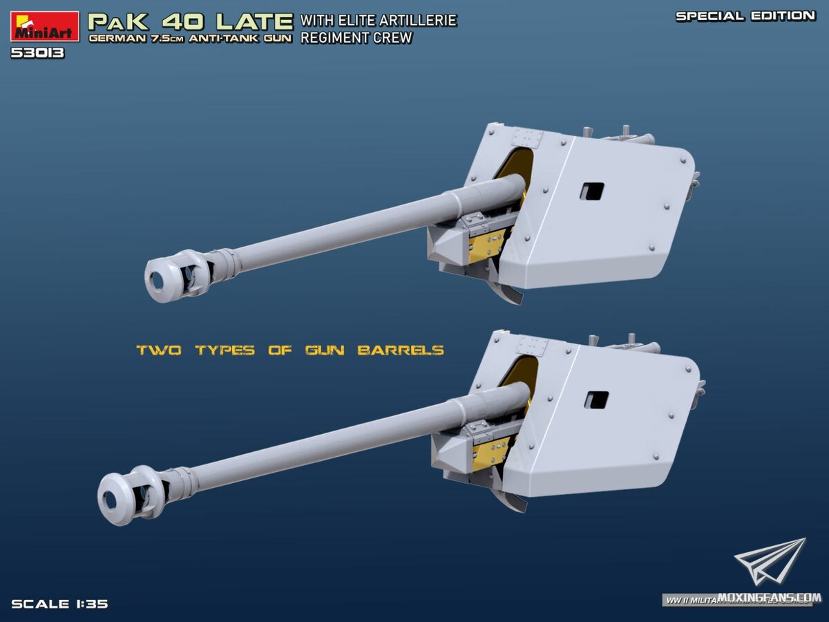 MINIART预告了一款新品:1/35比例的7.5cm PaK40反坦克炮后期型。从介绍来看,这款新品附带蚀刻片,提供多种可选零件,附带4名炮组,4款涂装可选。
