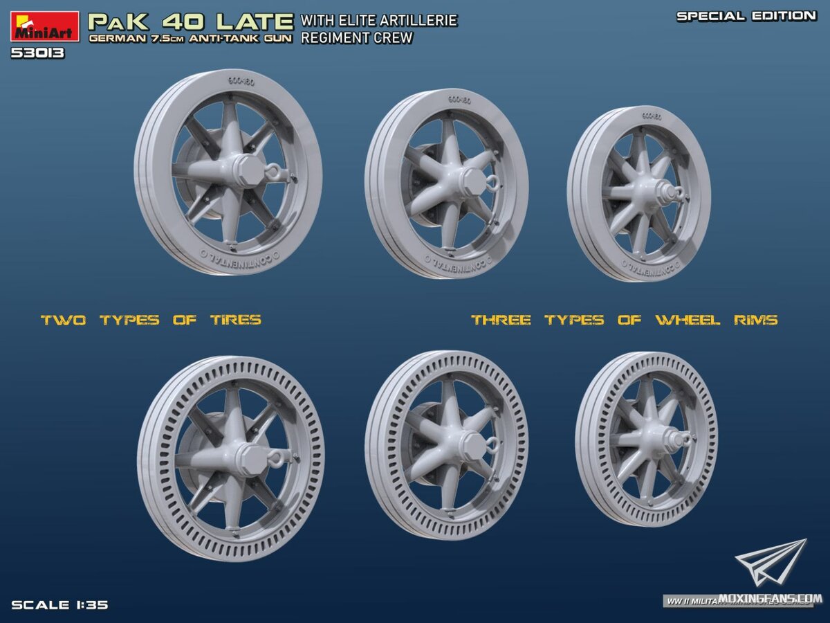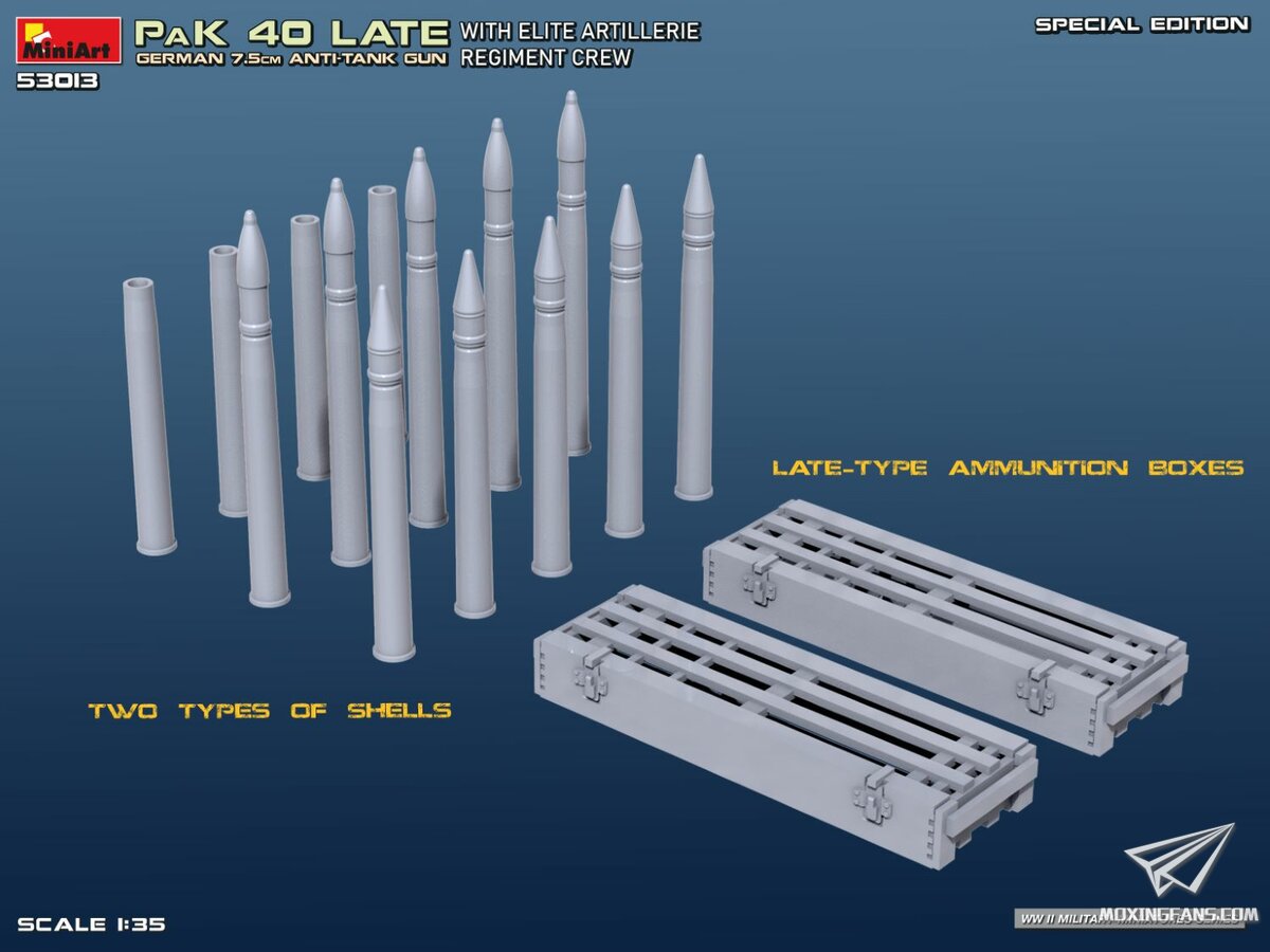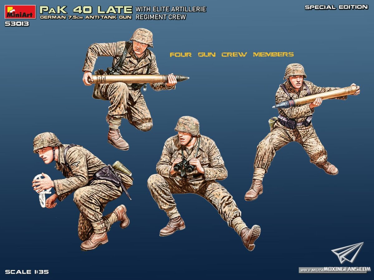 MINIART预告了一款新品:1/35比例的7.5cm PaK40反坦克炮后期型。从介绍来看,这款新品附带蚀刻片,提供多种可选零件,附带4名炮组,4款涂装可选。