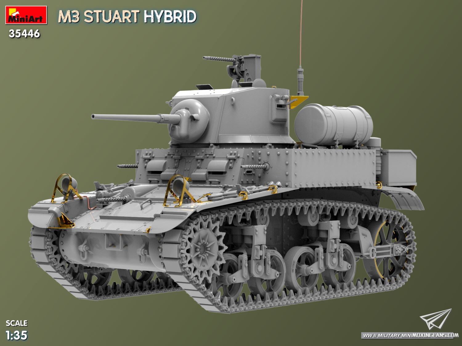 MINIART预告了一款新品:1/35比例的M3斯图亚特轻型坦克混合型。从介绍来看,这款新品附带蚀刻片,提供4款涂装可选,将于近期上市。