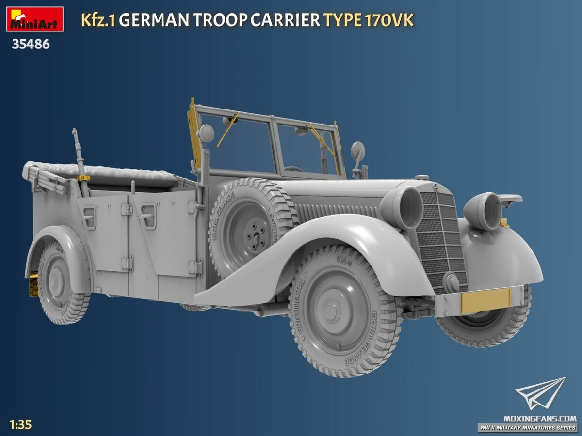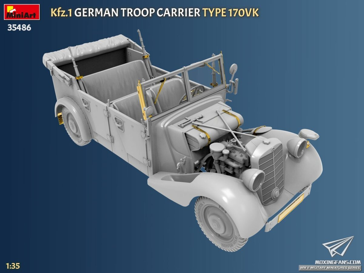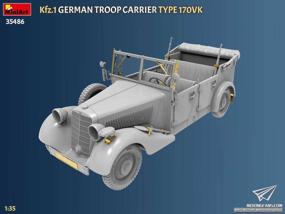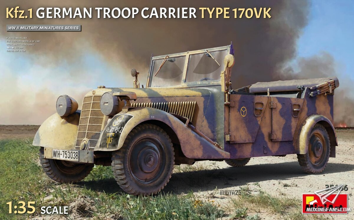 MINIART预告了一款新品:1/35比例的170VK军官车。从介绍来看这款新品附带蚀刻片和透明件,开出了完整的底盘,悬挂和内饰细节,将于近期上市。