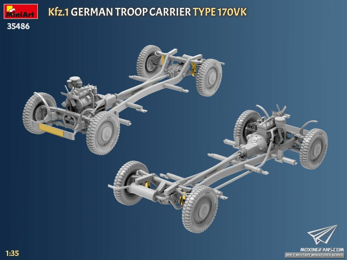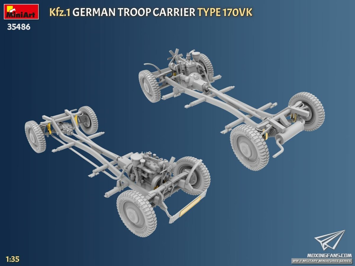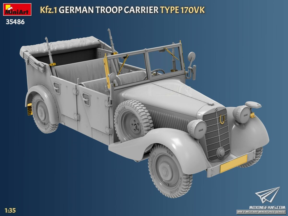 MINIART预告了一款新品:1/35比例的170VK军官车。从介绍来看这款新品附带蚀刻片和透明件,开出了完整的底盘,悬挂和内饰细节,将于近期上市。