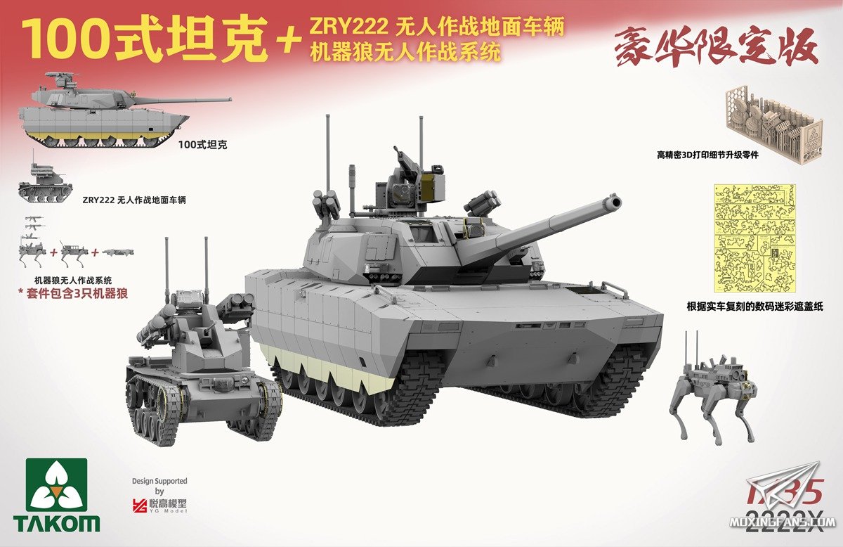 2222X:1/35 ZTZ-100主战坦克豪华限定版 舱门可制作成打开或关闭状态;附带蚀刻片和透明件;可动悬挂;可动路轮;可动履带;附带3D打印零件;附带数码迷彩遮盖纸;2款涂装可选。 包含ZRY222无人作战地面车辆和3只机器狼无人作战系统。