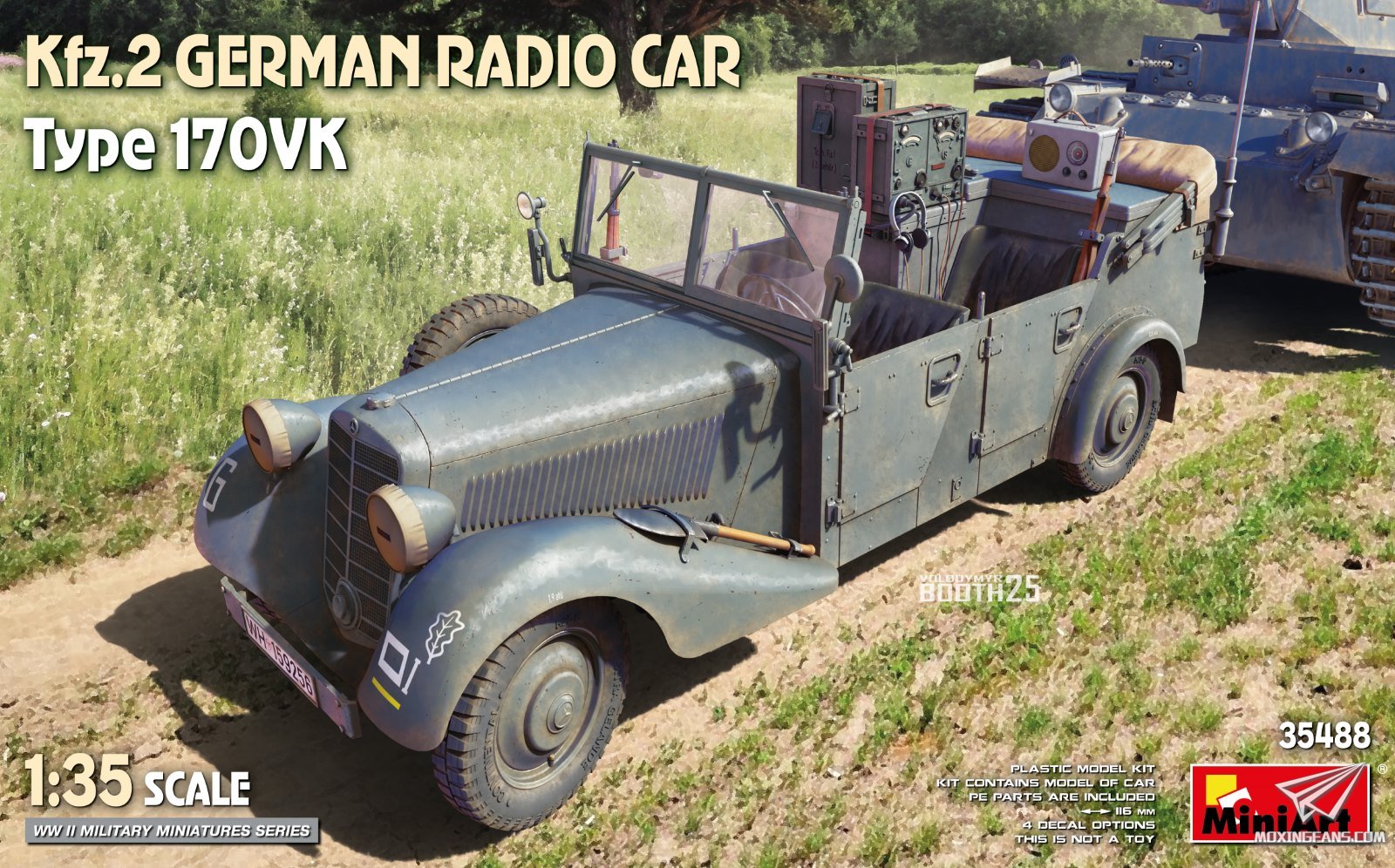 MINIART预告了一款新品:1/35比例的Kfz.2 170VK型通信车。从介绍来看,这款新品附带蚀刻片,车厢内增设了大型电台和天线,将于近期上市。