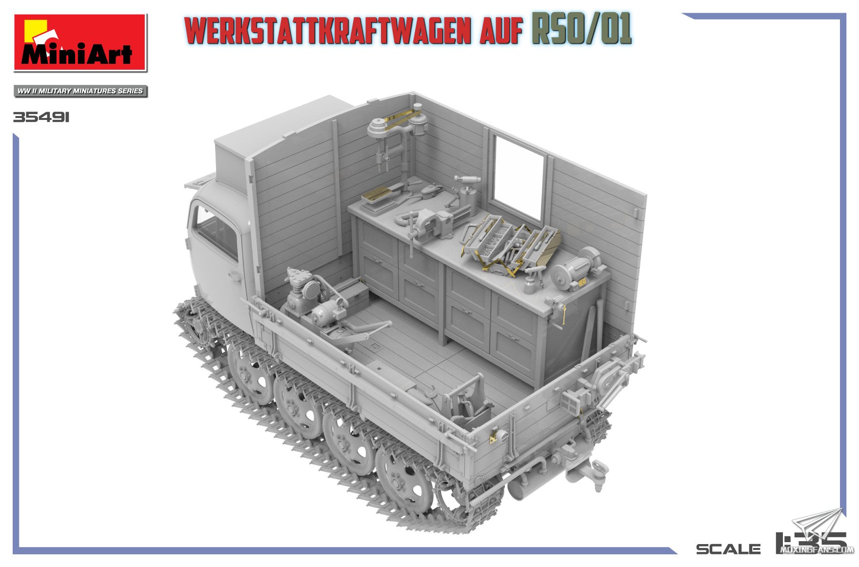 MINIART预告了一款新品:1/35比例的RSO/01维修车。从介绍来看,这款新品附带蚀刻片和半拼接履带,开出了修理仓的内构,将于近期上市。