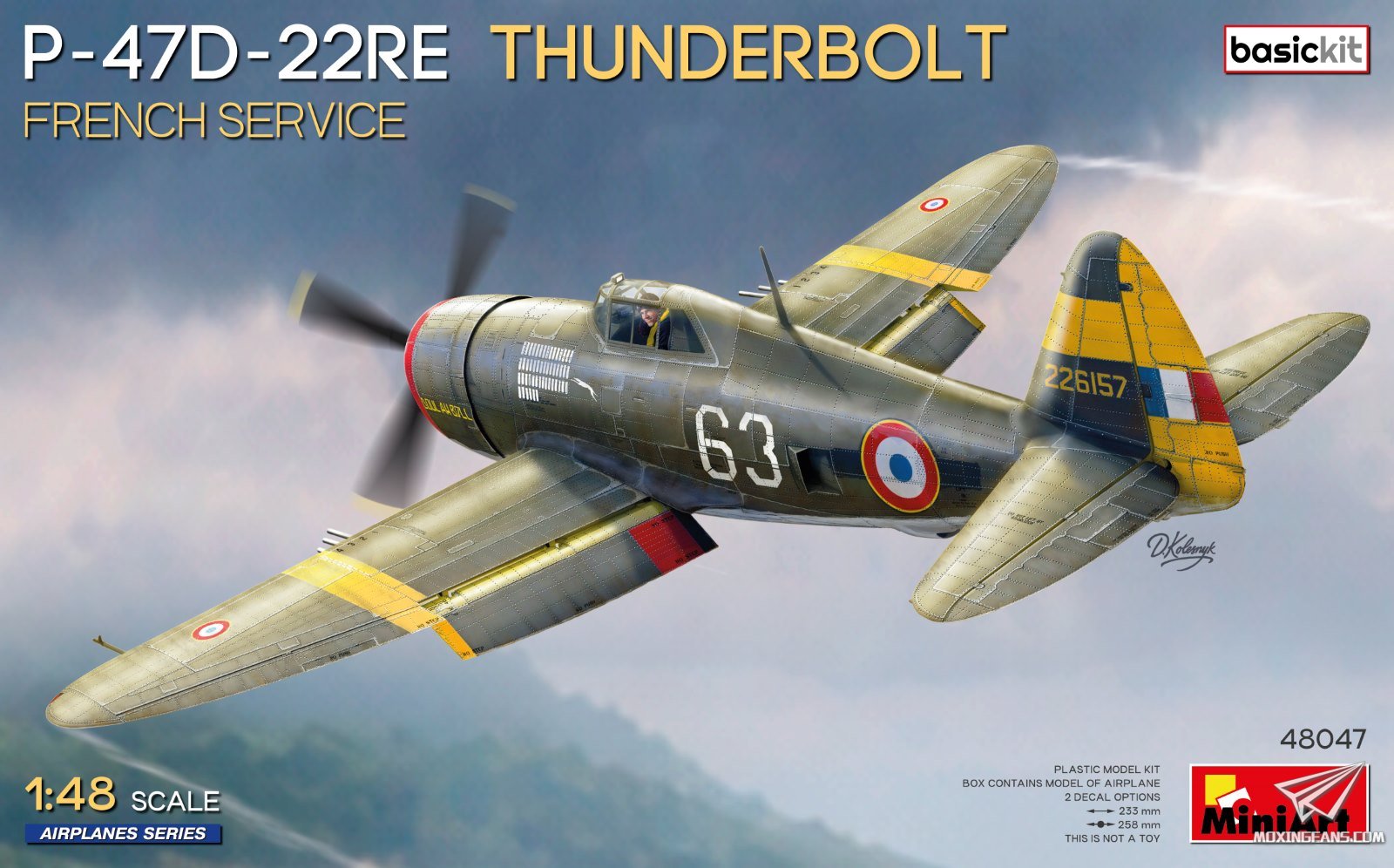MINIART预告了一款新品:1/48比例的P-47D-22RE雷电战斗机法国版。从介绍来看,这款新品是基础版,不含蚀刻片,提供2款法国涂装可选。