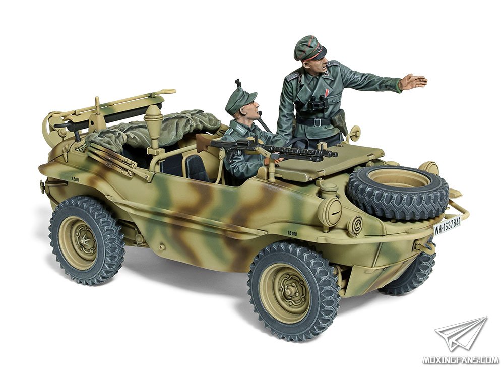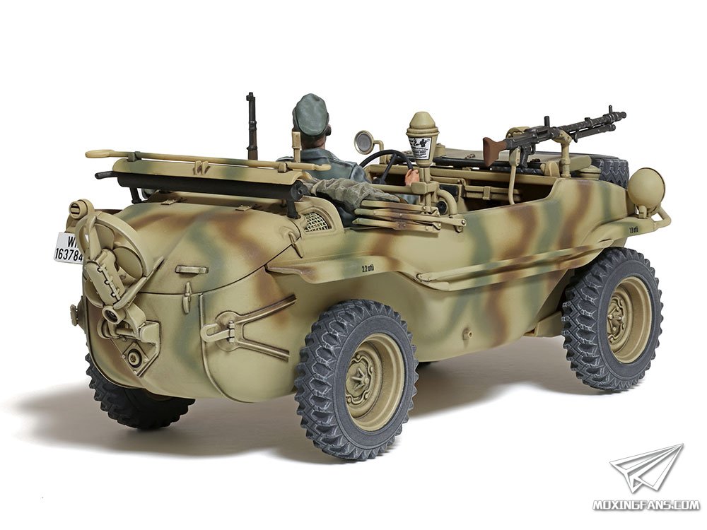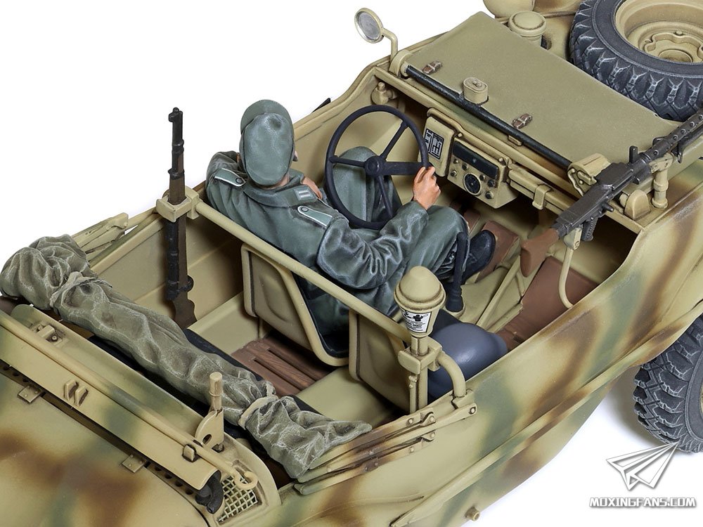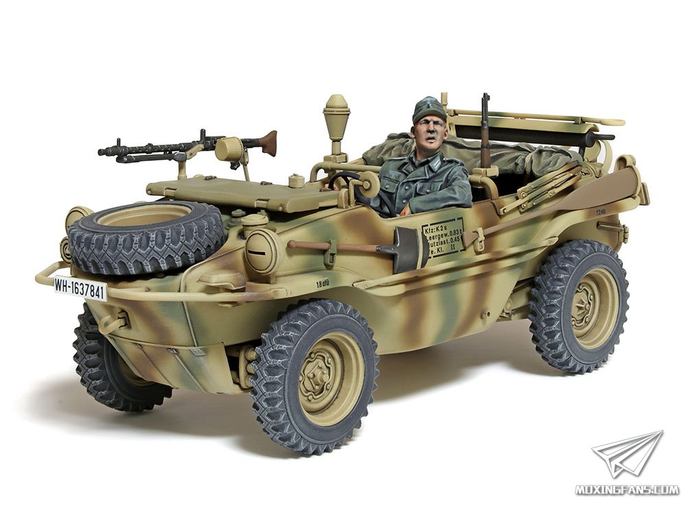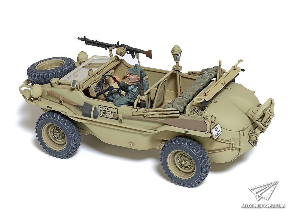 田宫正式发布了这款宽轮版的166桶车,官网介绍如下: 1/35比例,全长113mm,全宽42mm;船型车体下部采用滑动模具一体成型,兼顾组装便捷与真实感;车体周围和发动机部分立体感十足;200mm的加宽轮胎为单独开模,为弧形车体增加了几分威猛;附带MG34机枪和支架,可折叠帆布遮罩挡风玻璃、可放入步枪架的Kar98k步枪以及铁拳反坦克火箭弹;附带驾驶员和军官人形。