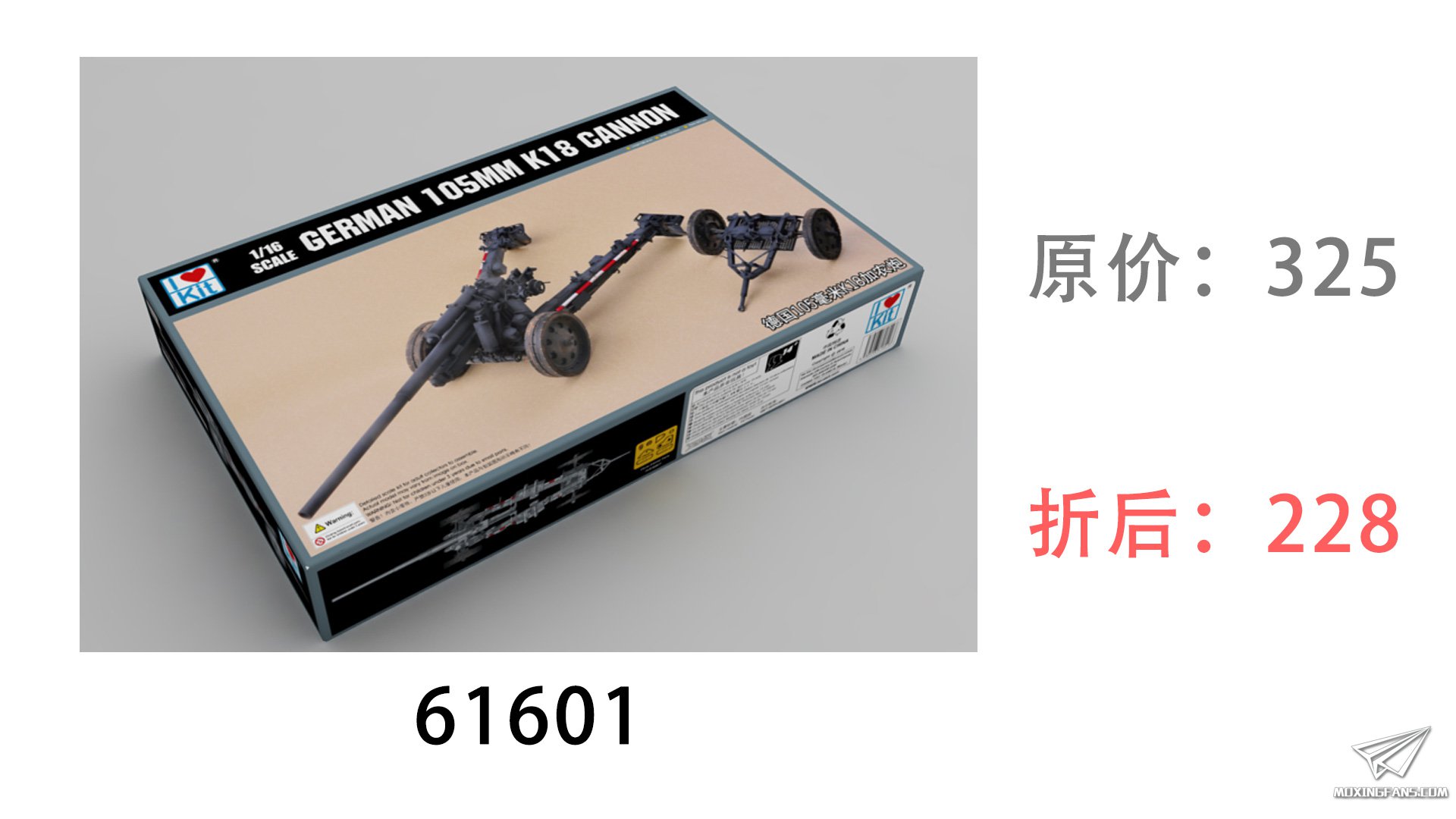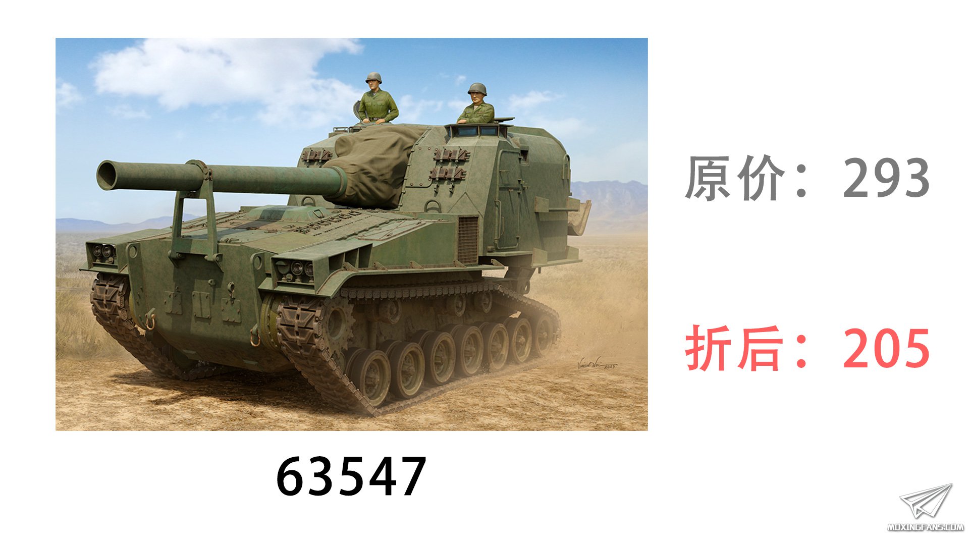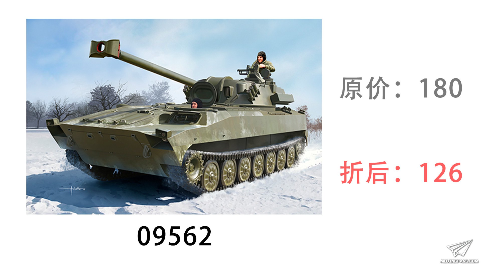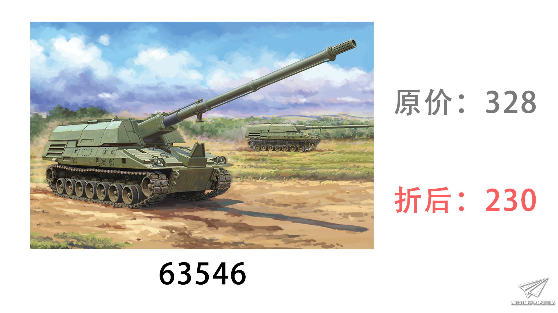17,M53 155毫米自行火炮。熟悉坦克世界的都应该对这门9.5级火炮印象深刻,曾经是小编最喜欢玩的9级火炮。这个题材小号手曾经推出过2款套件,这次特价的是155mm的M53,203mm的M55并没有特价。这盒套件小编当年是第一时间高价入手的,主要是题材好,细节并不算丰富,尤其是炮根的防雨布开的非常抽象,而并没有给出炮塔内构,所以无法做成发射状态,附带蚀刻片和半拼接履带,原价293元,现价205元。