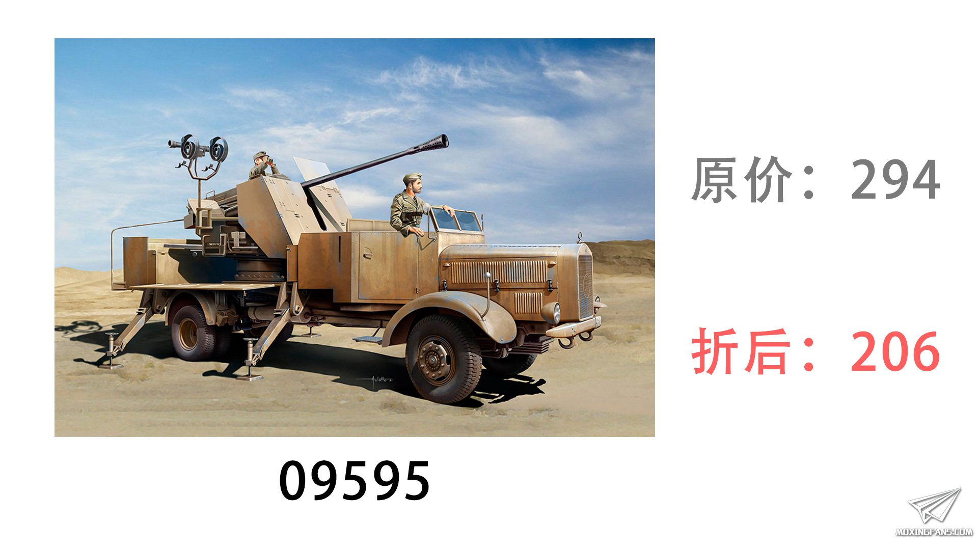 7,L4500A装甲车搭载5cm Flak41防空炮。L4500A不少见,Flak41也有不少,但是把这俩组合到一起的只有小号手了。这盒套件2022年上市,车和炮单独哪一个都不是市面上最好的版本,但是组合在一起就是唯一的选择了,开出了发动机内构,可以制作成战斗或运输状态,附带蚀刻片和软胶轮胎,原价294元,现价206元。