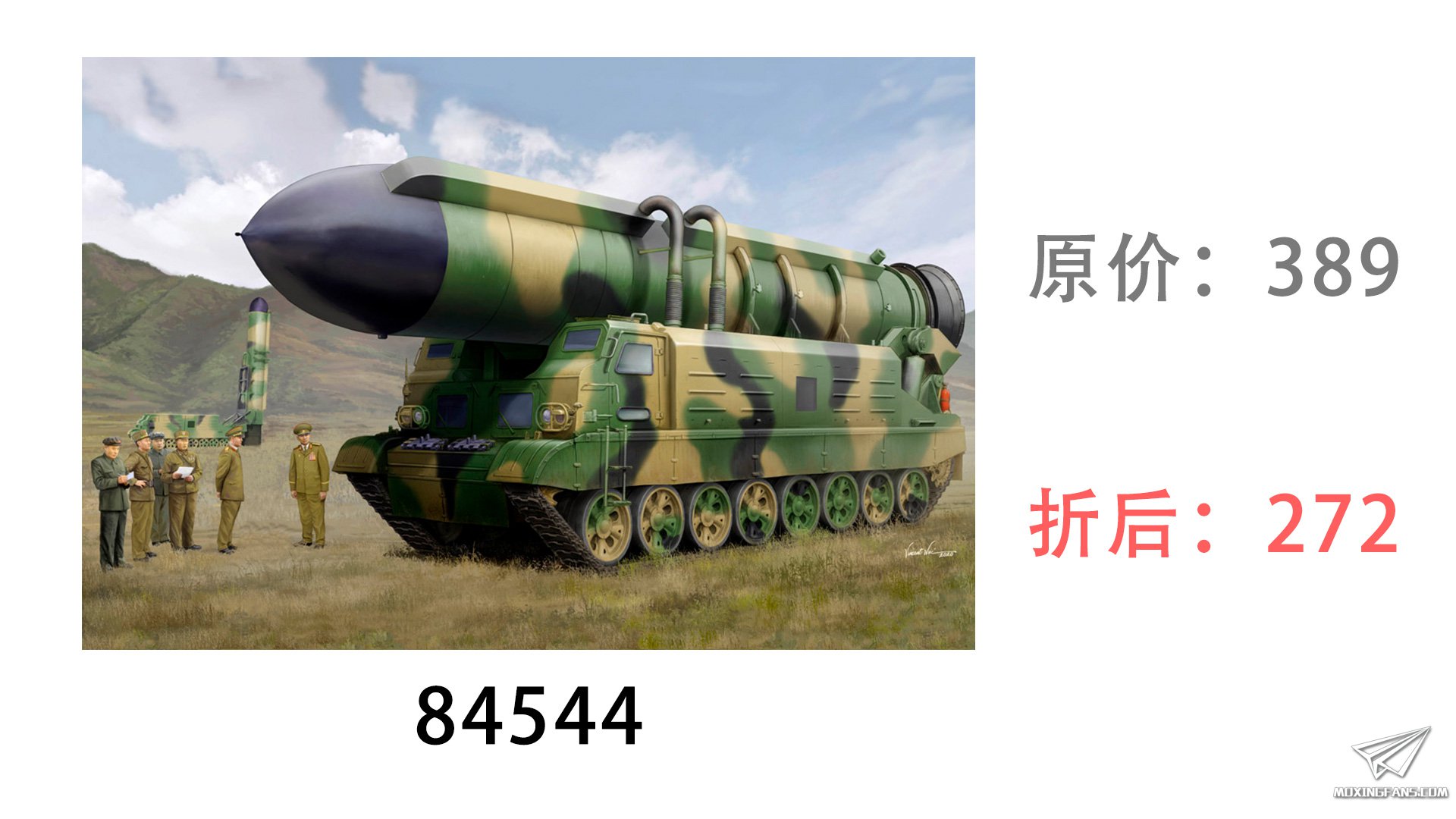 8,北极星-2弹道导弹。这款北极星-2是这次单子里武德最充沛的陆地装备了,体积巨大,而且看上去还胖乎乎的,甚至有些萌萌的感觉。这盒套件2020年上市,属于小号手绝对的独占题材,别无分店,附带蚀刻片和拼接履带,原价389元,现价272元。