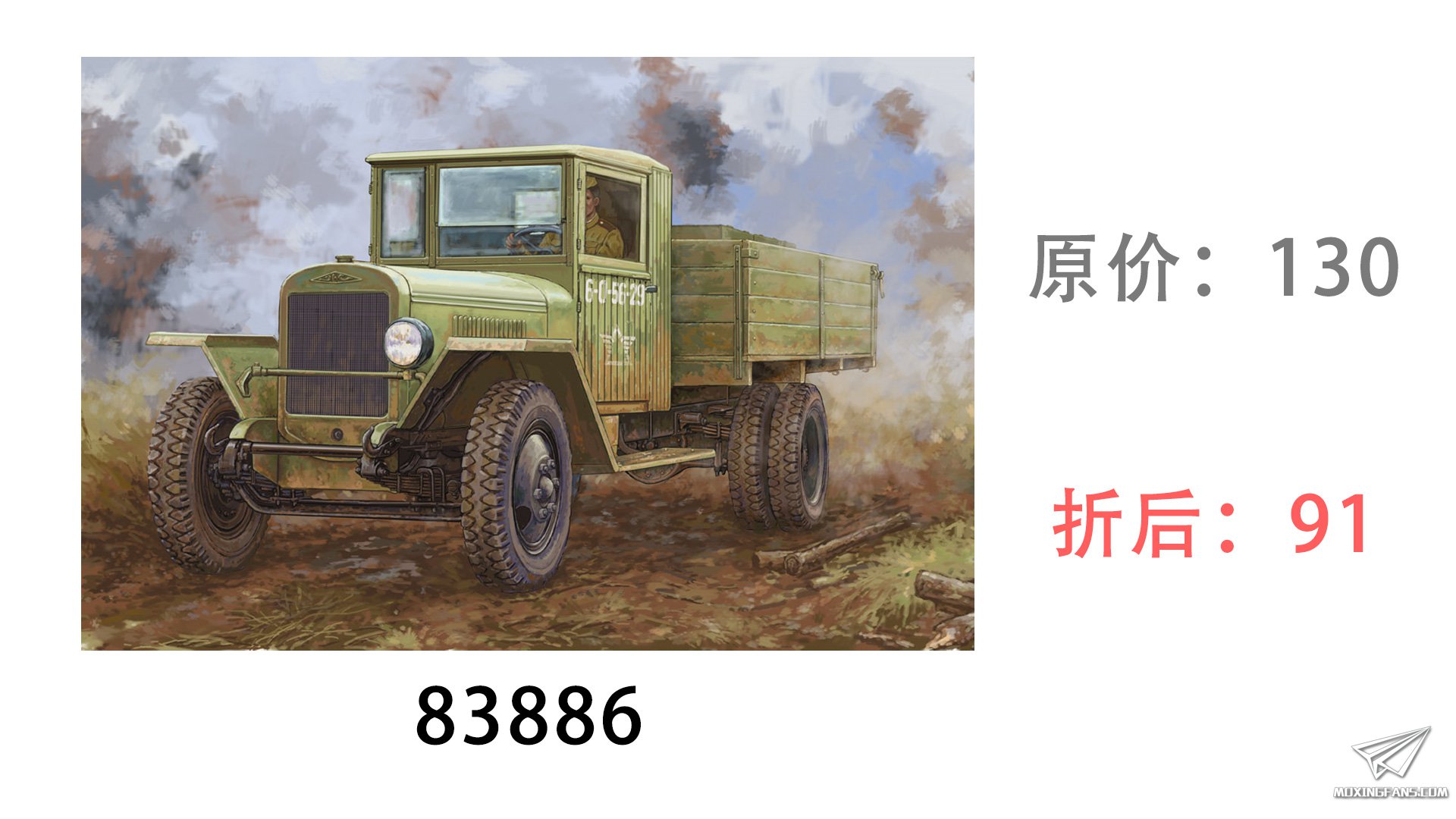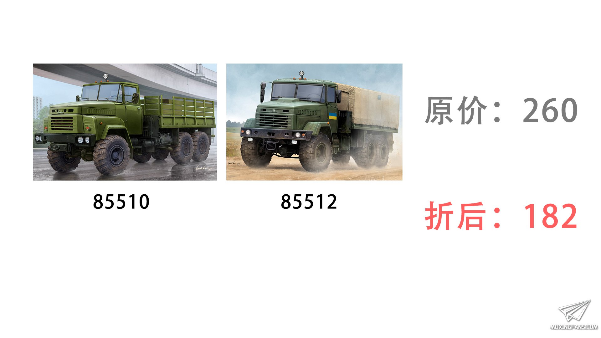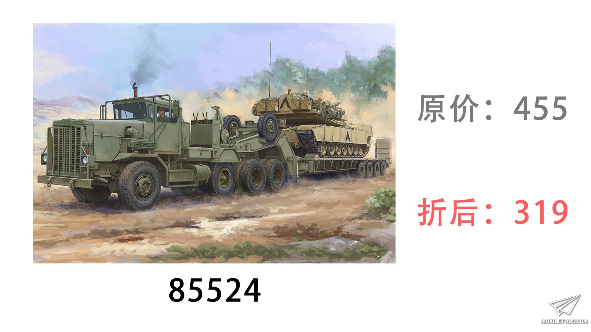 12,M911重型牵引车及64T拖板。这是小号手的又一款重磅产品,跟上一款M911的主要区别在于托板部分,2022年上市,作为当年和MENG打架打出来的衍生型号,这个系列还是比较用心的。整体来说M911也是走的孔武有力的路线,大量直线线条,很符合小编的审美,完成品长度超过60厘米,放在家里还是很震撼的,附带蚀刻片和软胶轮胎,不含发动机内构,原价455元,现价318元。