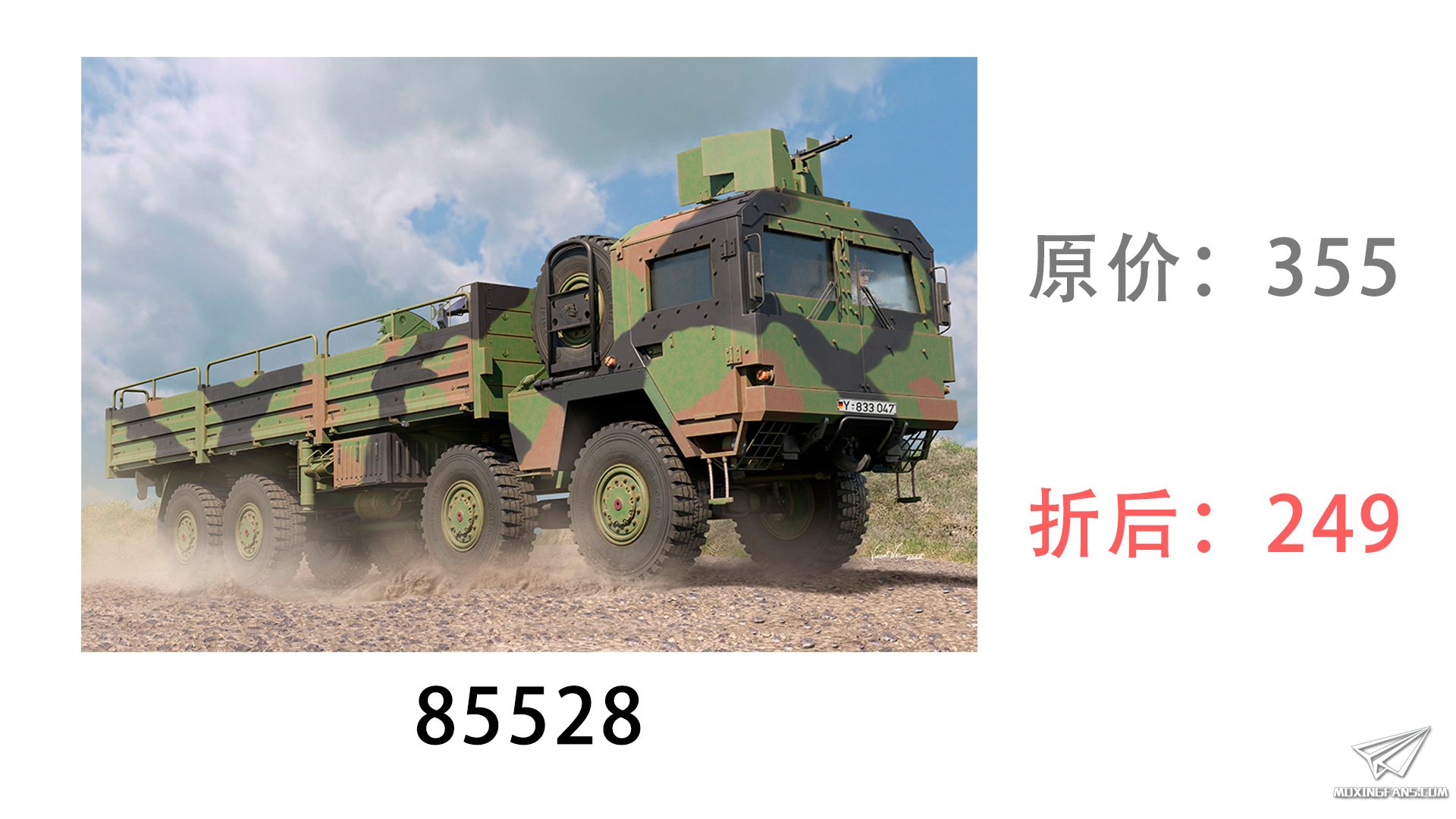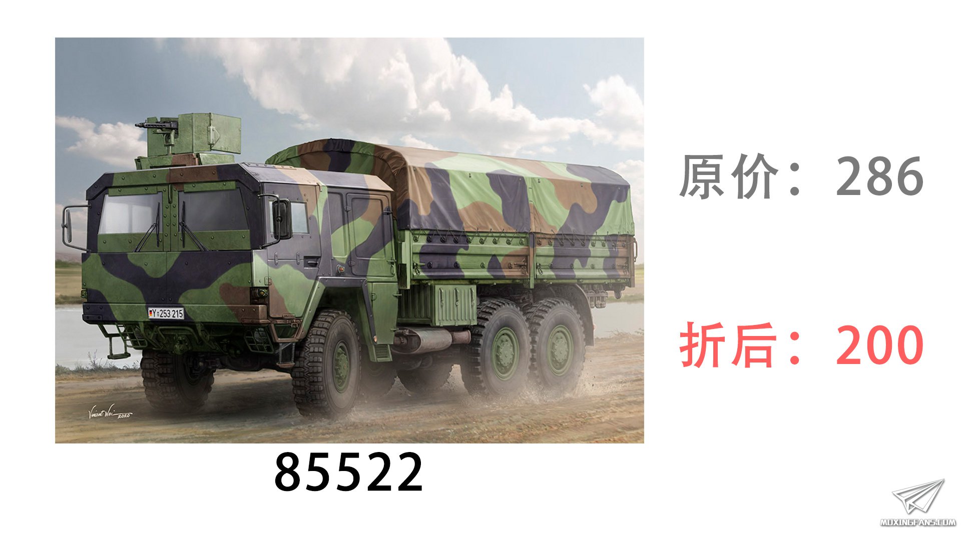 10,德国7吨卡车。其实这就是大名鼎鼎的MAN牌7吨卡车,是我们比较熟悉的MAN牌5吨卡车的二哥,因为版权问题所以并没有标明。MAN的军卡都是方方正正的造型,比较符合小编的审美。市面上能选的除了利华20年前的老货,就小号手的这款可选,细节方面表现还是可以的,附带蚀刻片和软胶轮胎。值得一提的是,虽然这盒套件的封绘上有车棚,但是套件里是不含车棚的,原价286元,现价200元。