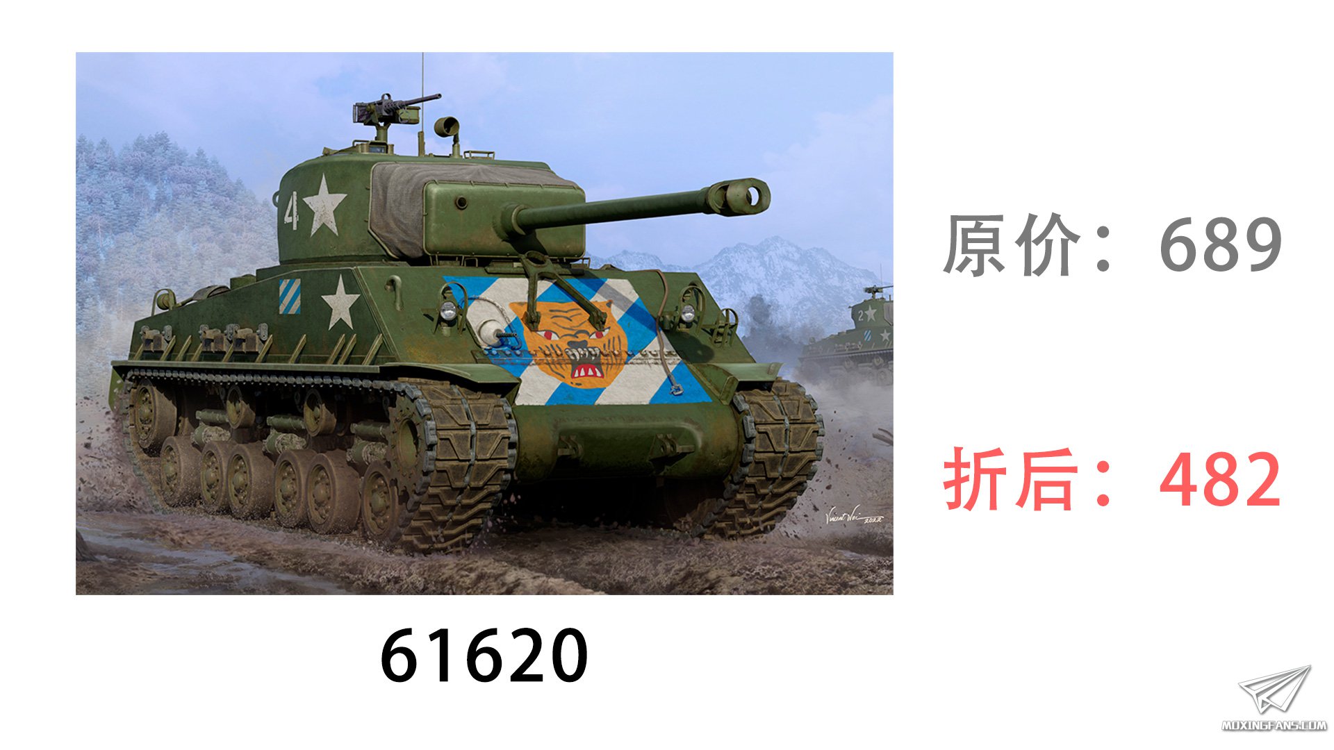15,1/16的M4A3E8中型坦克。当各家都在35比例谢尔曼题材上打的头破血流的同时,小号手已经开始布局16比例产品。这盒谢尔曼是空壳版不含内构,体积巨大,附带活动悬挂,活动履带,树脂兵人和4张蚀刻片,配置方面非常的豪华,对于喜欢16比例模型的模友来说性价比不错,原价689元,现价482元。