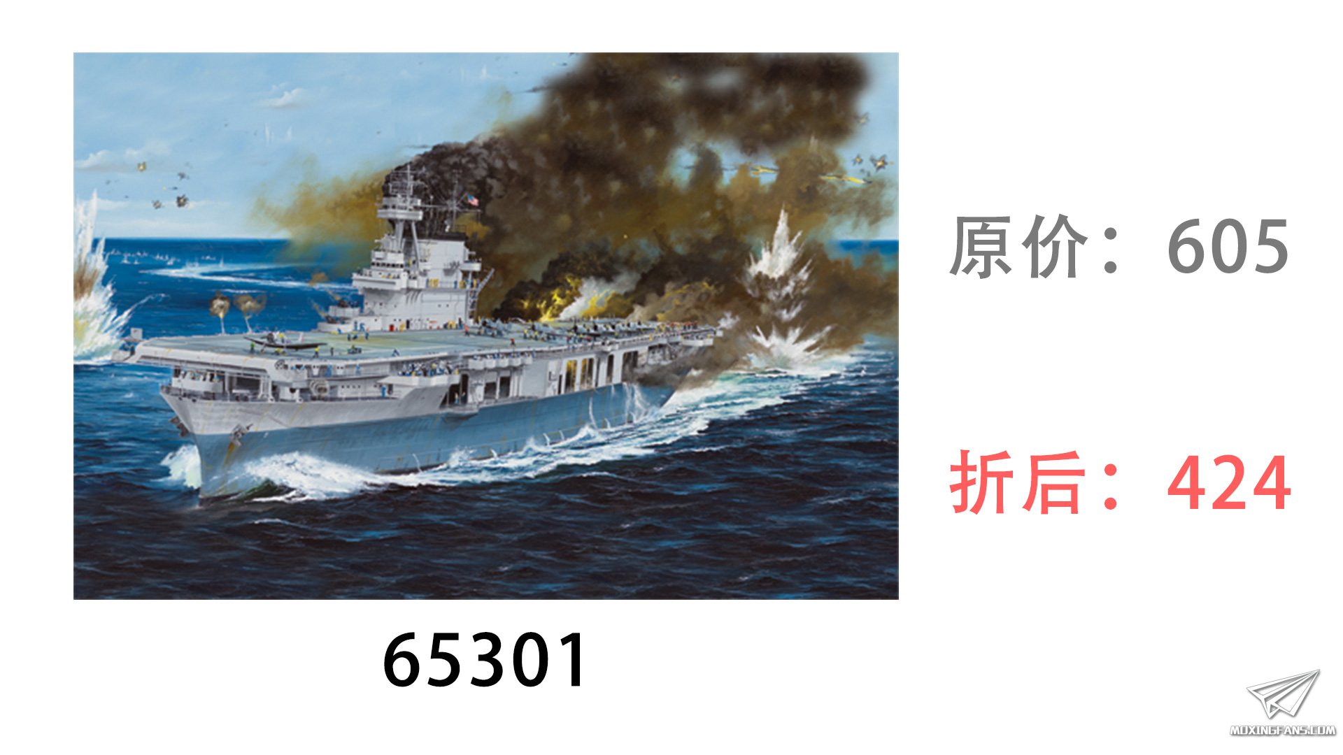 18,再来看两条1/350的航母,分别是现代的肯尼迪号和二战的约克城号。再350航母领域小号手有绝对的霸主地位,基本上没有竞争对手,有看中的闭眼买就行了。肯尼迪原价796元,现价557元,约克城原价605元,现价424元,四五百买350的航母,想想就刺激。