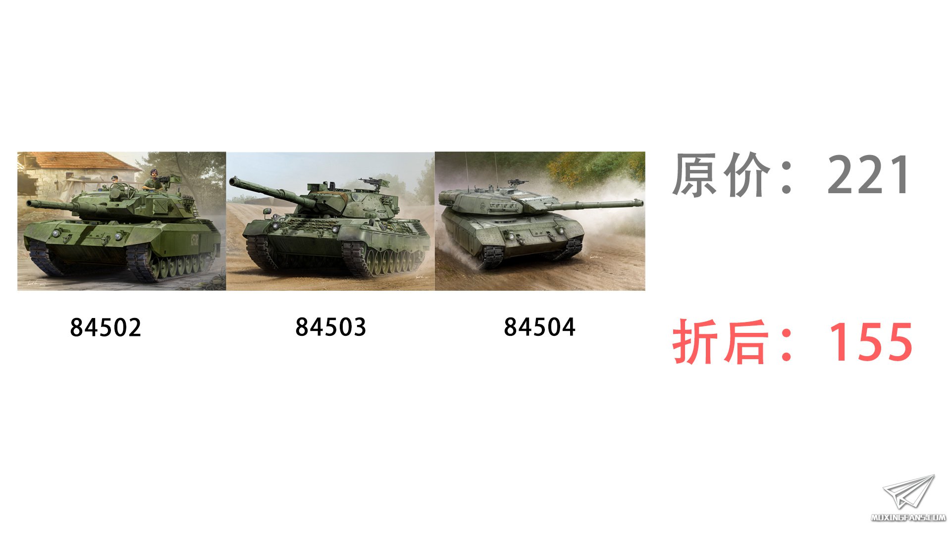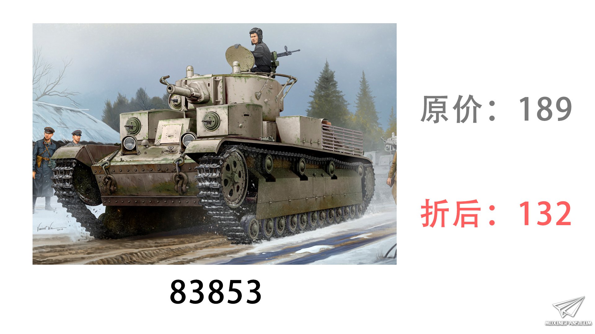 6,T-80UD主战坦克早期型。小编前段时间分别制作了小号手的T-80BVD和麦田的T-80U,总体感受不管是细节还是配置小号手是比不上麦田的。但是小号手毕竟是大厂,衍生型号非常丰富,这款T-80UD就属于小号手的独占题材,适合喜欢UD这个型号的模友。T-80UD相对于T-80U最明显的区别是使用了柴油机而非燃气轮机,在外观方面很容易区分。这盒套件2021年上市,附带蚀刻片和拼接履带,原价230元,现价161元。