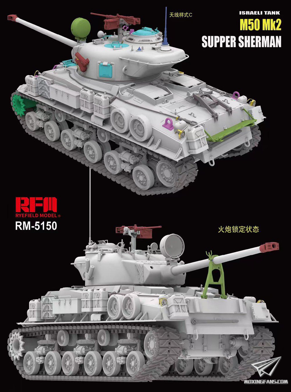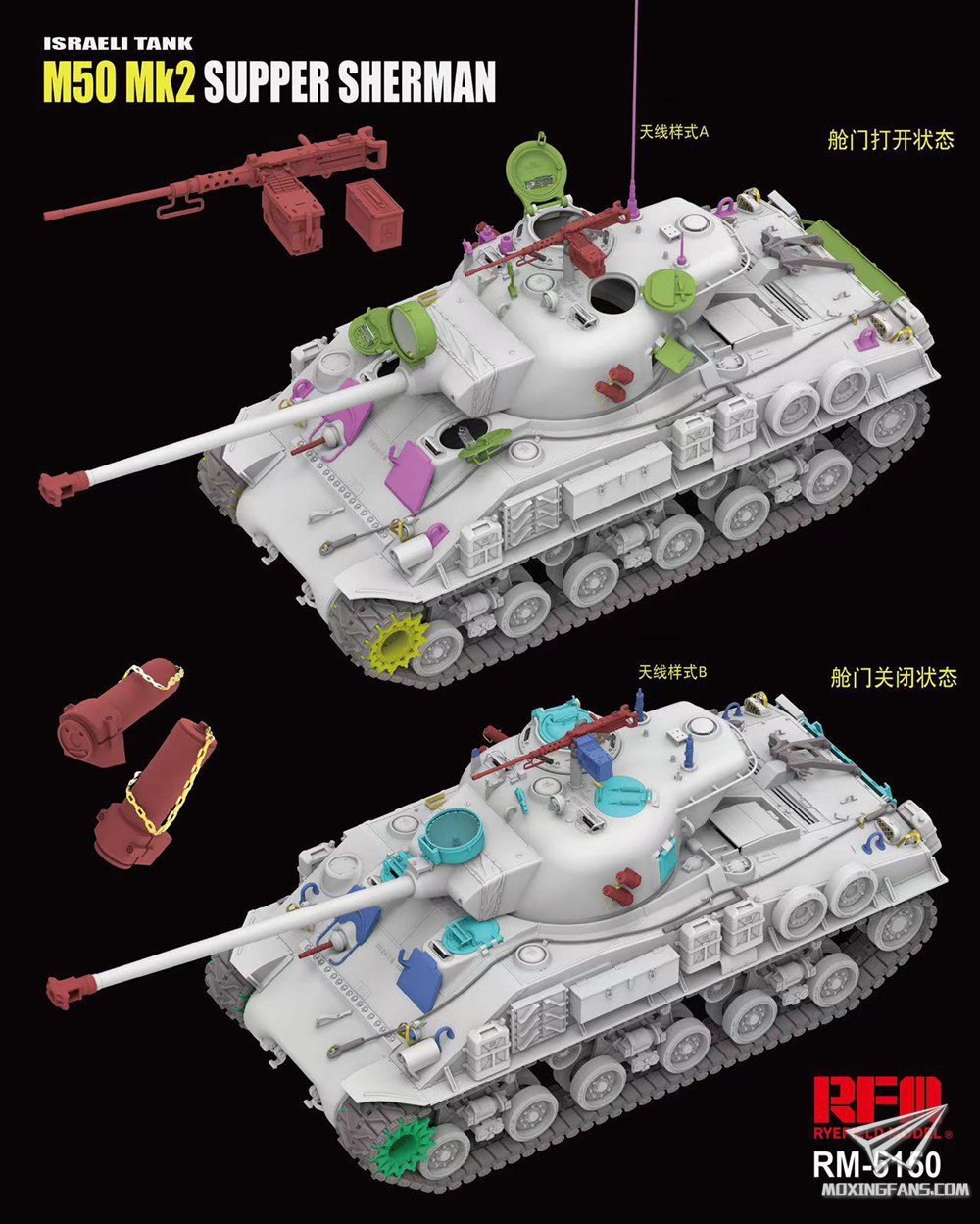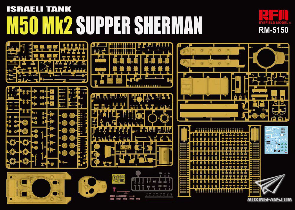 麦田的特价产品就到这里了,不知道大家感觉如何,接下来咱们来看双十一期间发布的新品。 首先是35比例的M50 MK2超级谢尔曼。知道你们想问什么,小编迷迷糊糊的查了下资料,MK1跟MK2的最大区别是发动机部分。从麦田给出的信息来看,这款M50采用活动悬挂加活动履带的配置,附带蚀刻片和3D打印零件,提供了数量可观的选装零件。另外,小编猜测这款M50的推出应该是非常匆忙的,你看配置图上的英文,超级谢尔曼都成了晚餐谢尔曼了。这款M50官价是199元。同时麦田还推出了附带更多蚀刻片和3D打印零件的高配版,官价是319元。