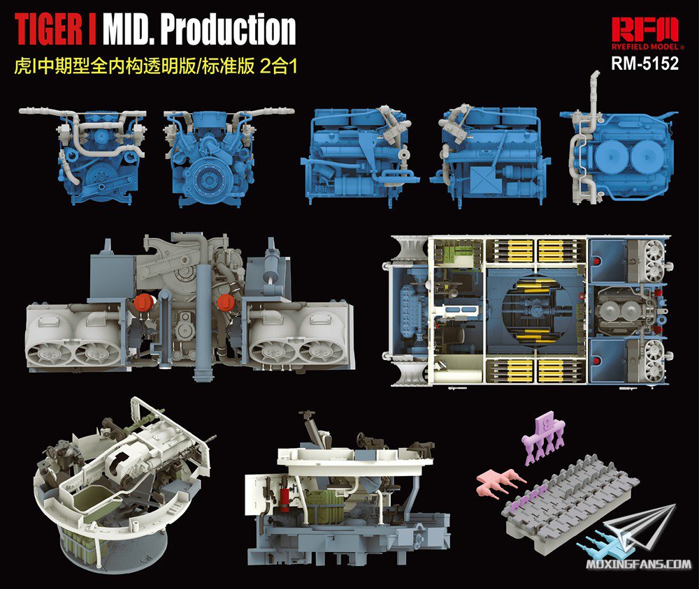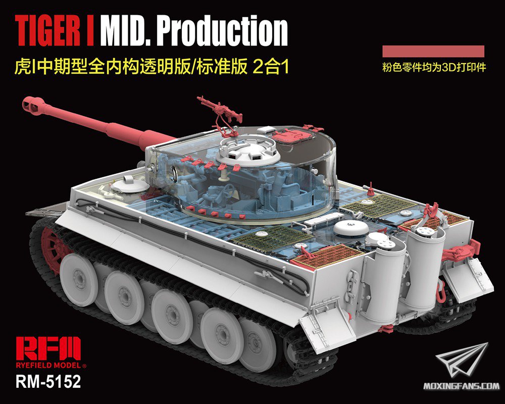 另一款新品是虎式坦克中期型全内构。小编之前说过,新手买全内构模型更推荐什么类型来着,这里就不重复了,麦田的全内构虎细节方面没问题,但是素组起来并不省心,更推荐有经验的模友制作。这盒套件全内构设计,附带蚀刻片和3D打印零件,提供了活动悬挂和活动履带,这次还提供了透明炮塔和透明上车体,官价是299元。