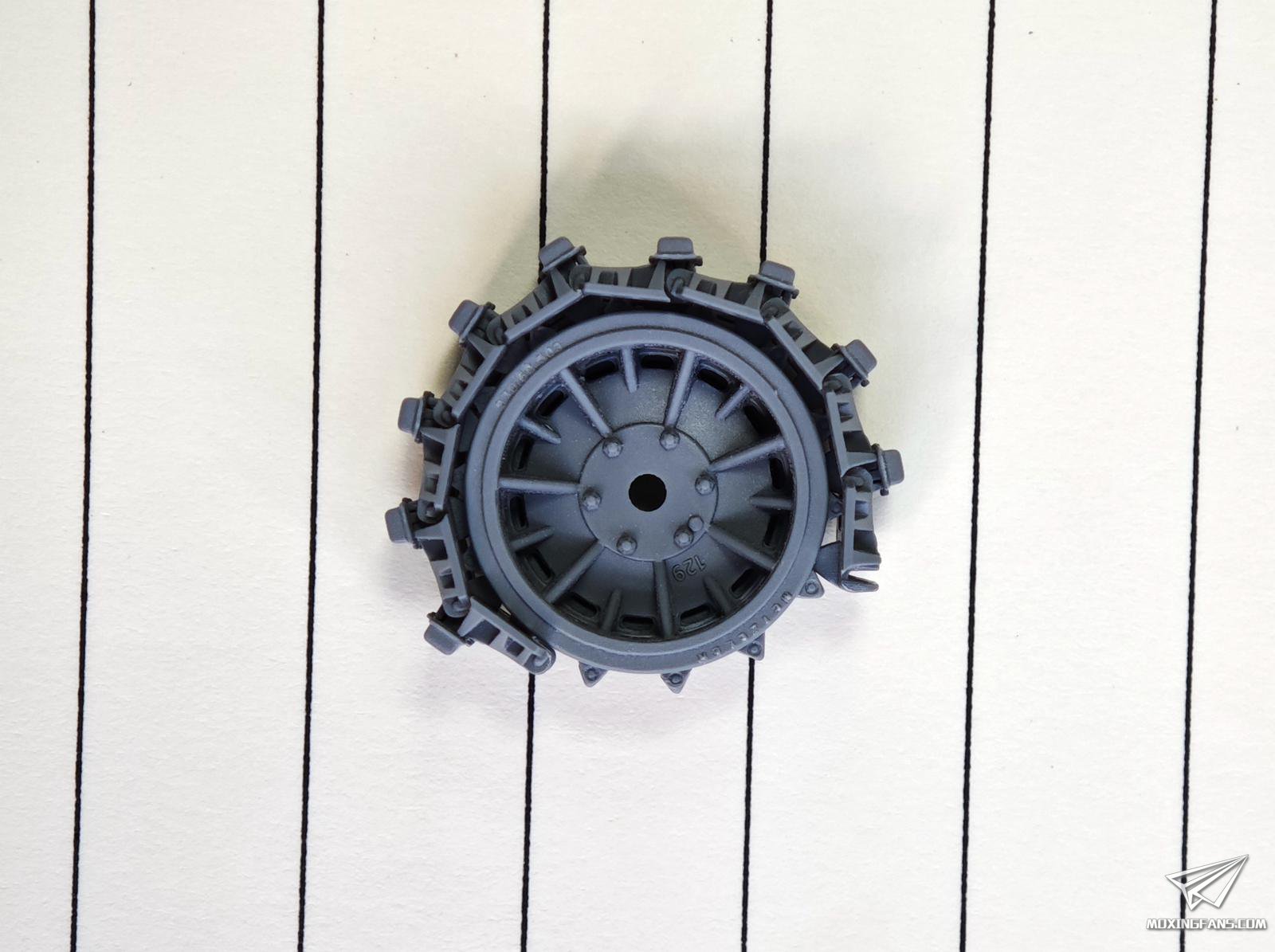 浅说下在行走部分制作过程中遇到的问题,如图所示:主动轮和活动履带并不匹配,之间会有大概1mm的间隙,起初笔者任务是主动轮齿轮开大了卡不进去,于是把齿轮圆头磨得尖尖的,然并卵~~单个齿可以深入无间隙了,但是履带整个装上去,还是有间隙,比之前只好了一点点;所以兄弟们也别打磨了,没用,我估计是齿轮的间距不匹配履带孔间距,厂家要修模建议修主动轮,装配上车也可以装,只是强迫症的肯定没法接受,有条件的朋友建议更换补品。