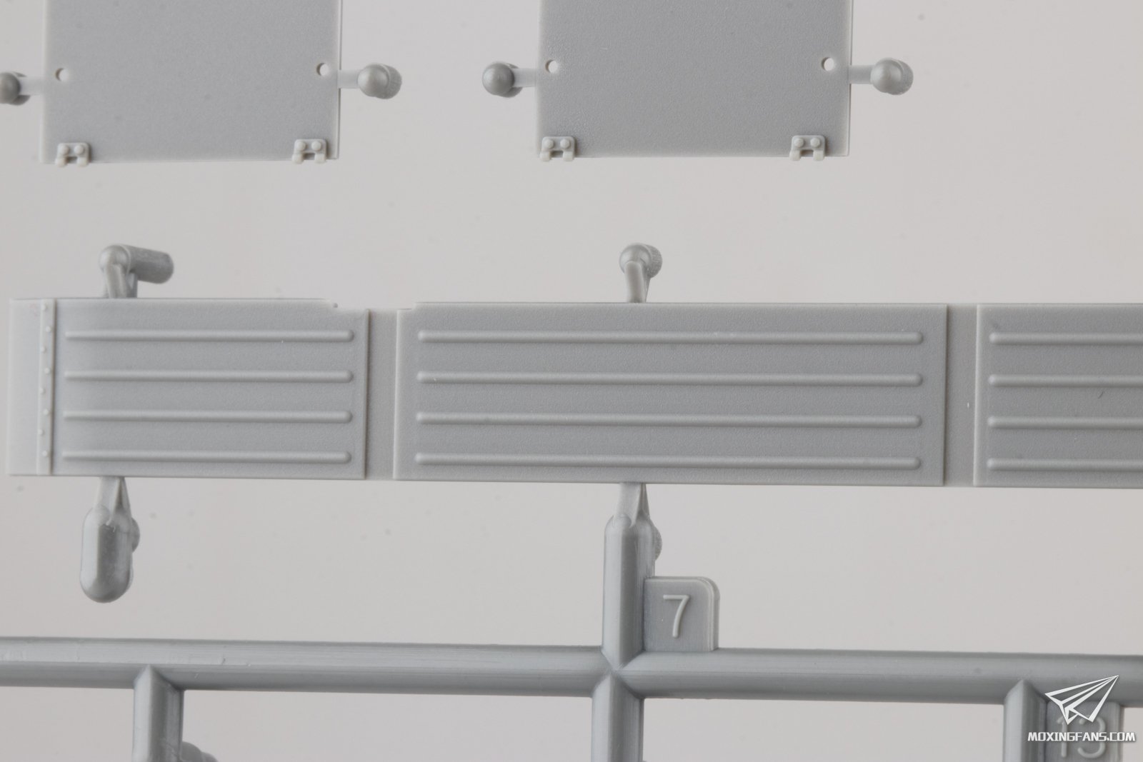▼ 战斗室主要零件的细节。各种铆钉细节依旧丰富,边缘干净利落,而且推出孔控制的也比较到位,战斗室内侧装甲板并没有明显推出孔。