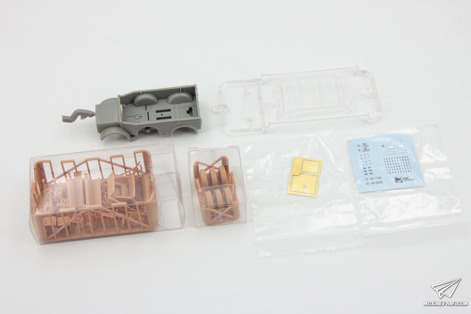 ▼ 威龙最近在尝试使用少量射出件和大量打印件的方式推出产品,这款1/72比例的霍希40型人员输送车就是其中之一。这盒套件的射出件占比极低,仅仅车壳主体和透明件为射出零件,其余部分均采用了3D打印来呈现,附带蚀刻片。