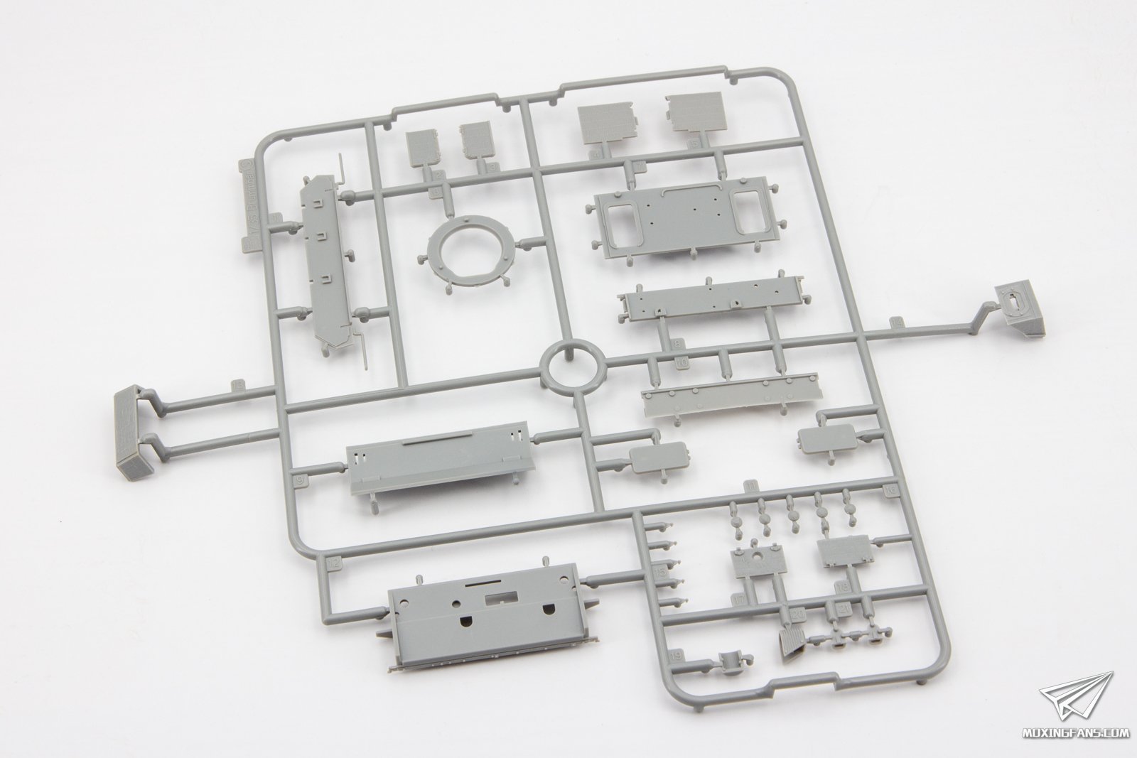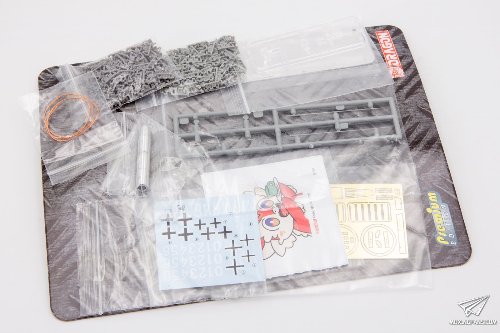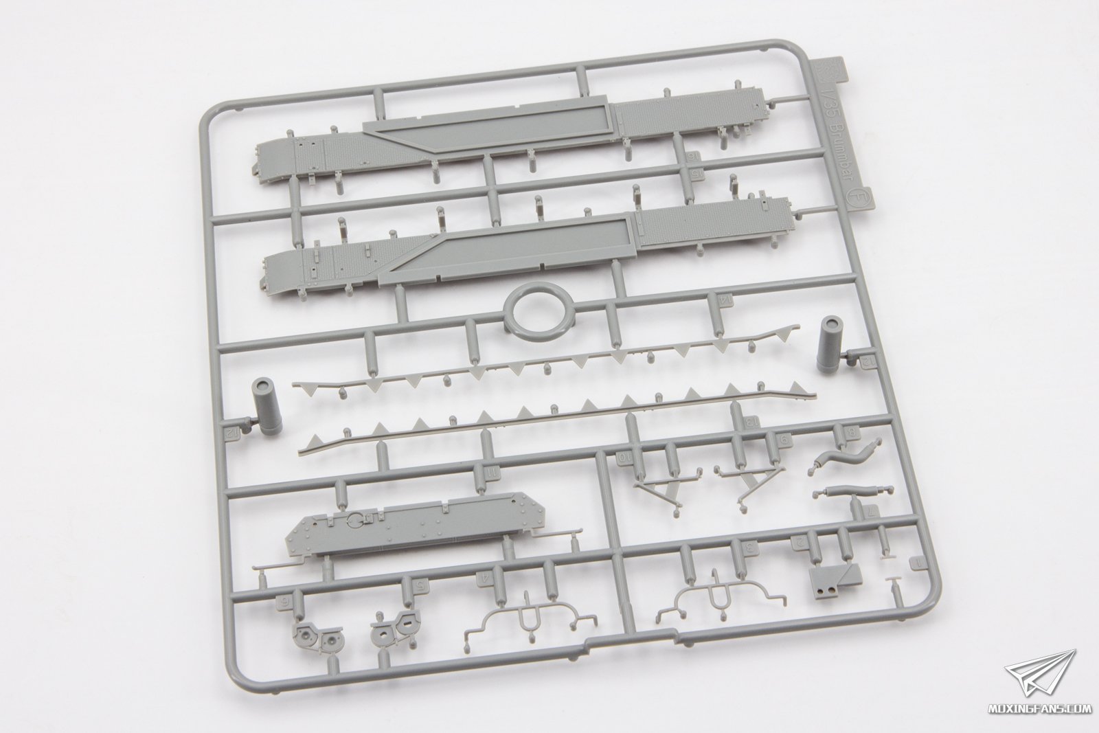 威龙近期再版了两款防磁灰熊,勾起了不少模友的兴趣,今天我们就来看这款中期型的防磁灰熊表现如何。 ▼ 板件为灰色PS塑料,黑卡重新回归,附带魔术履带,蚀刻片,金属侧裙板,铝合金炮管和一组人形。