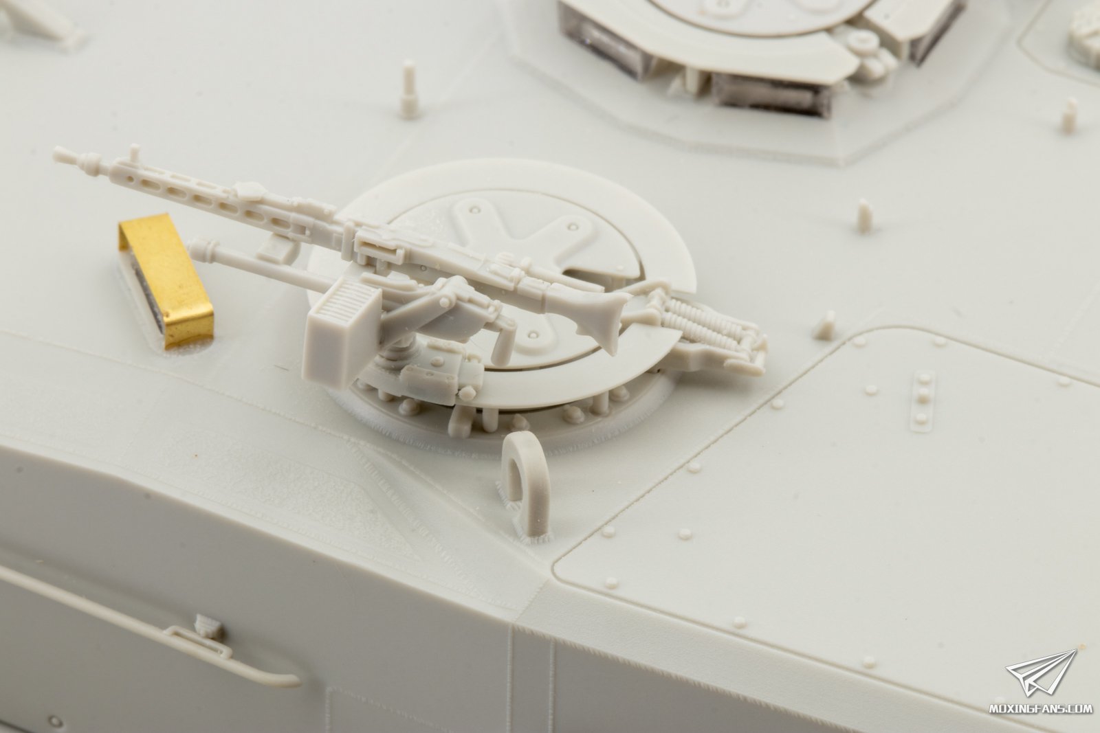 火炮是传统的两片式开模,根部的防雨布也开出了褶皱感,炮塔侧面的焊线开的比较锐利。