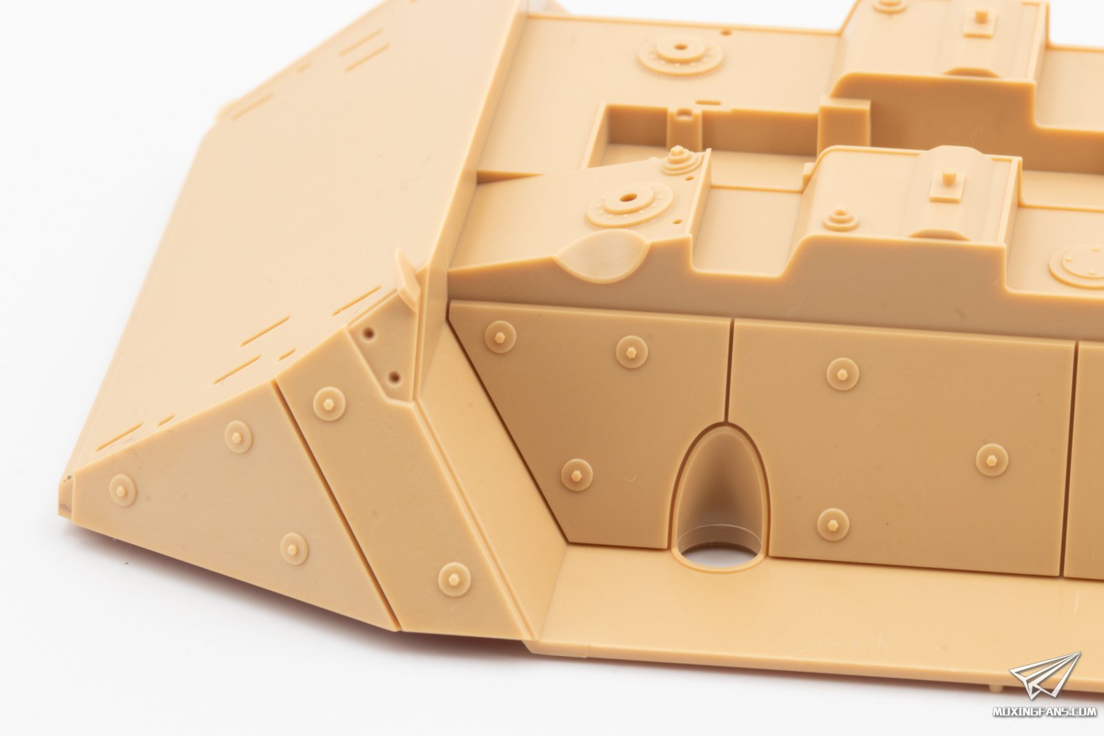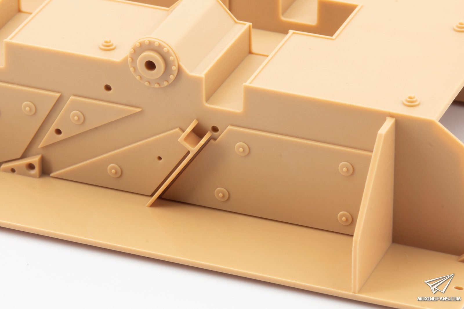 ▼ 下车体和上车体的细节,斯崔克标志性的大型螺栓开模比较工整,斜面上的螺栓头有轻微变形,但是并不严重,完全可以结束,装甲表面开出了细腻的防滑纹细节。