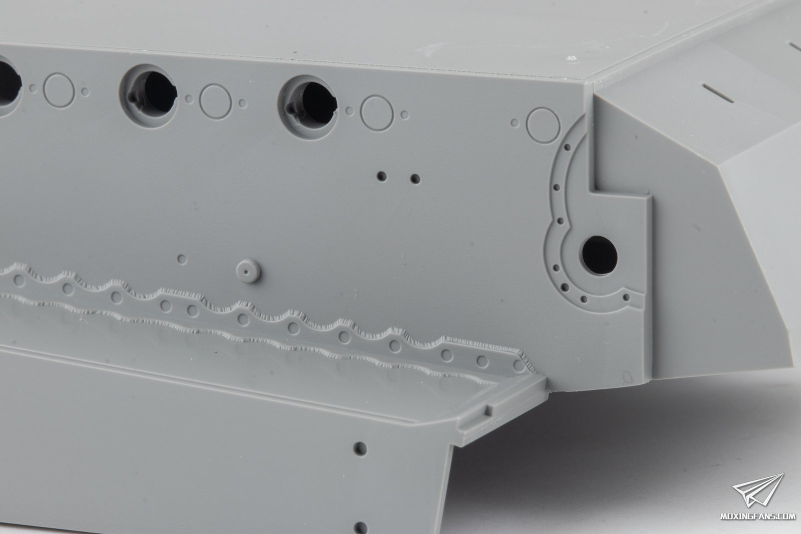 ▼ 履带和前部牵引基座的细节。履带为初期型惯用的无防滑齿的型号,诱导齿单独开模需要粘接,履带板正面有少量推出孔。