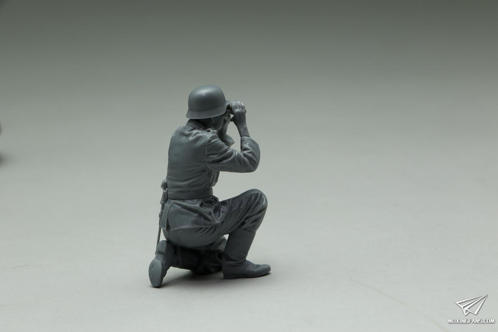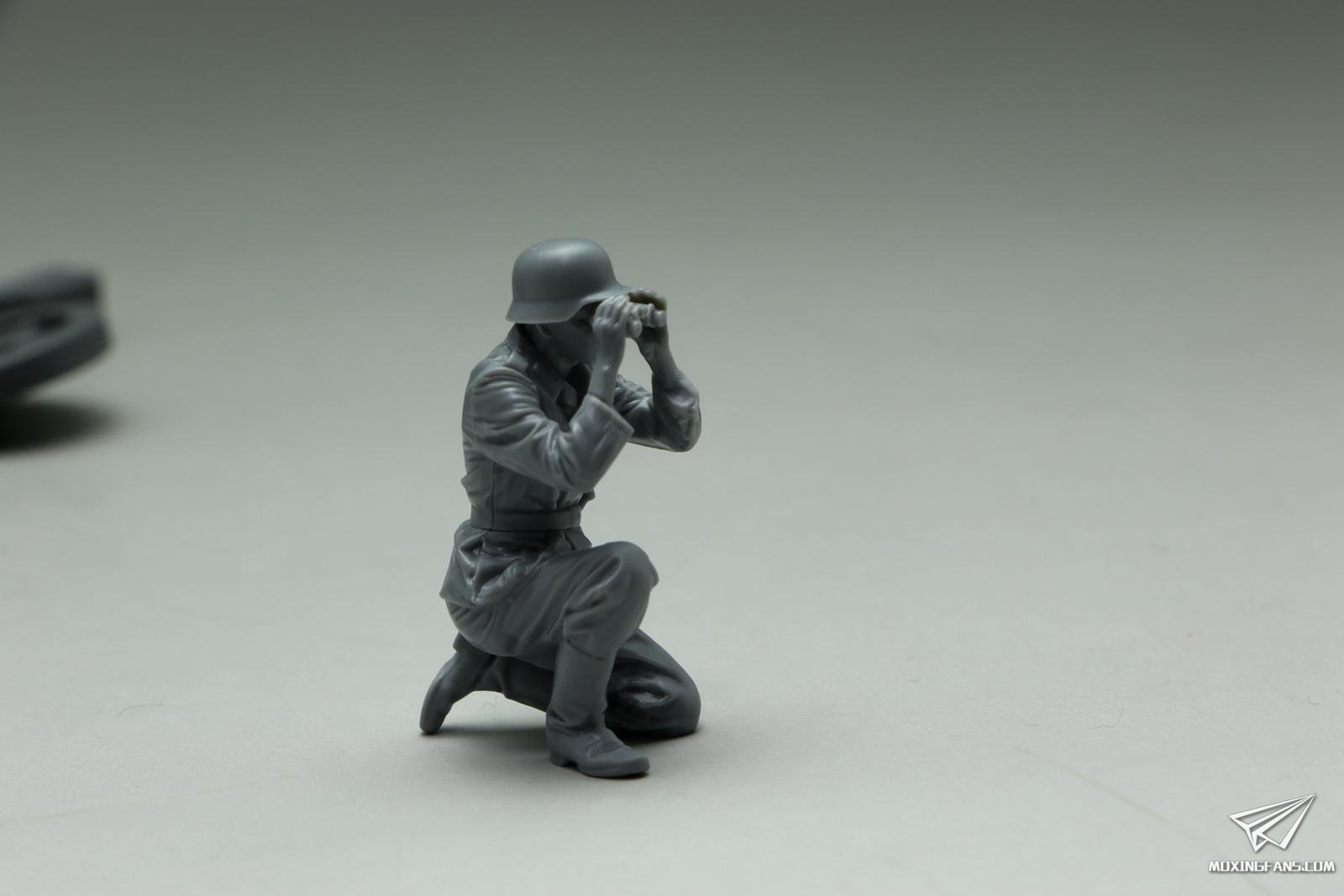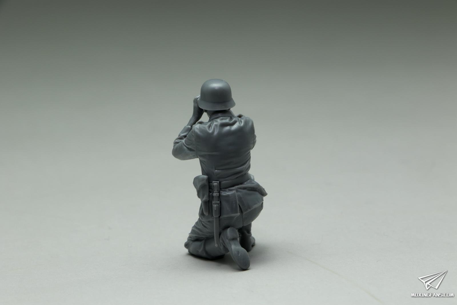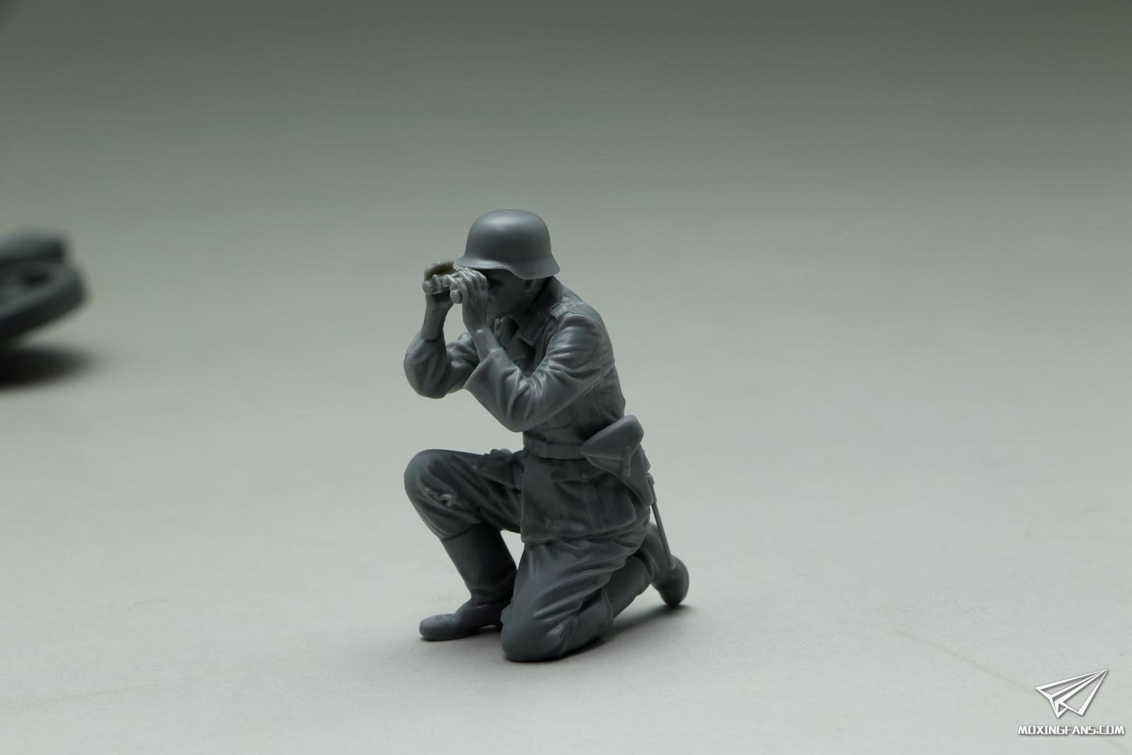 这名工作人员称之为指挥官吧,动作栩栩如生,望远镜没有粘接就恰好可以卡在手掌位置,而这个位置恰好对着双眼,笔者在制作之前也没有假组对位,只是按照兵人的粘接位进行粘接固定,而结果是非常完美的,而且所有的兵人四肢粘接到躯干上并未进行无缝处理,粘接缝几乎就是战斗服装的接缝位置,基本没有明显的缝隙,这就是田宫设计的过人之处,再次佩服!制作过程愉悦感就是这么来的。