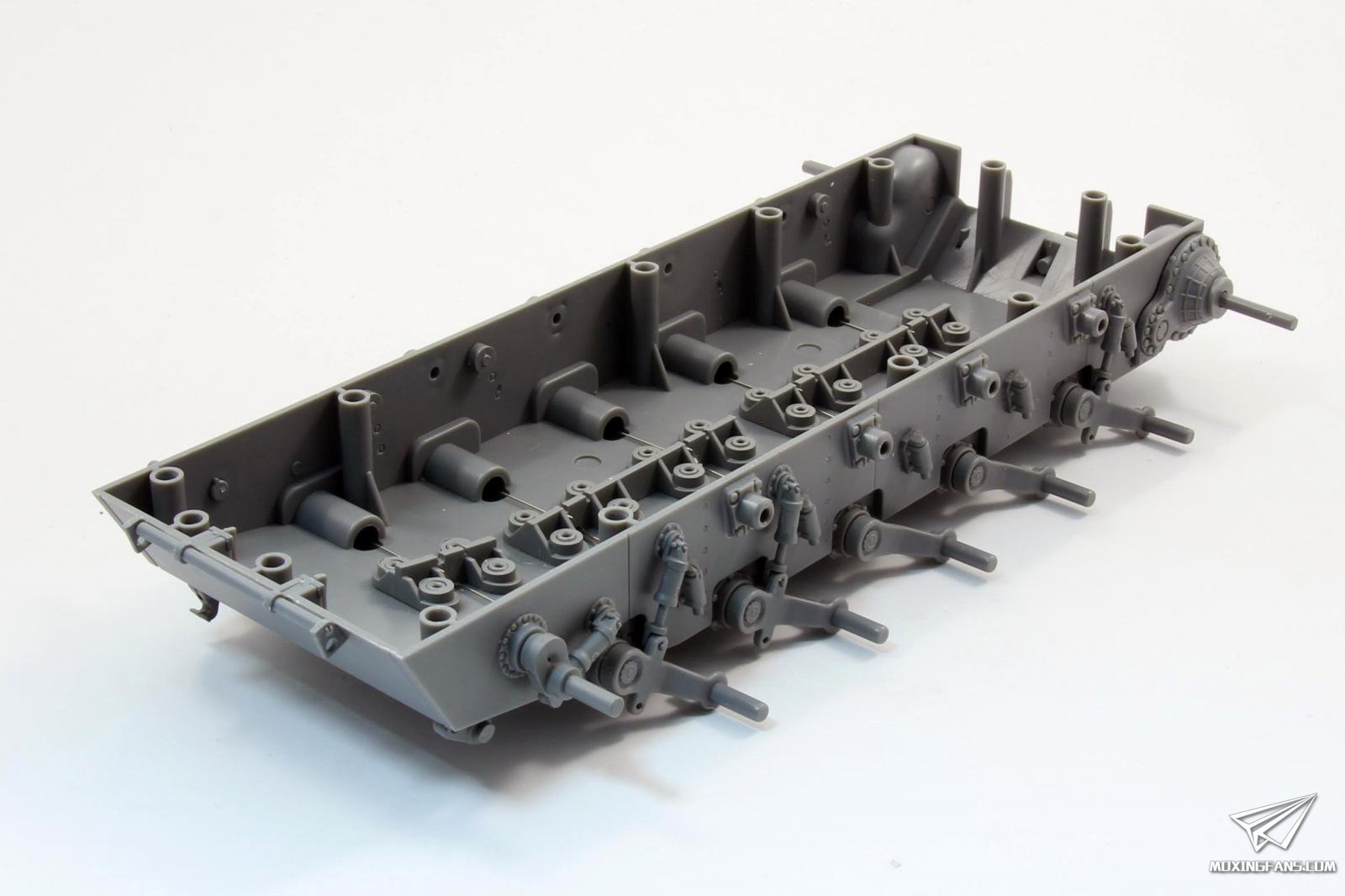 履带部分采用C型卡扣连结,,活动性和组合度都非常不错,组合感不好的地方是每节履带内侧有两处推出孔,是强迫症的话需要填补,成品如果多上一点土的话也不太明显。