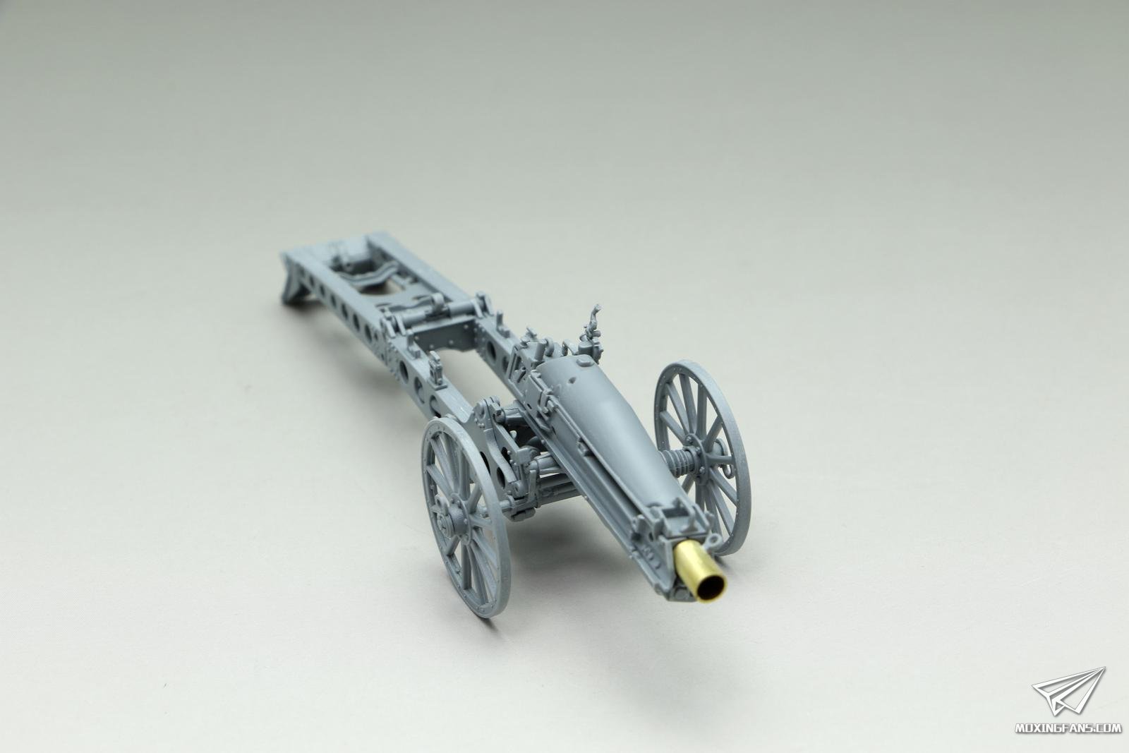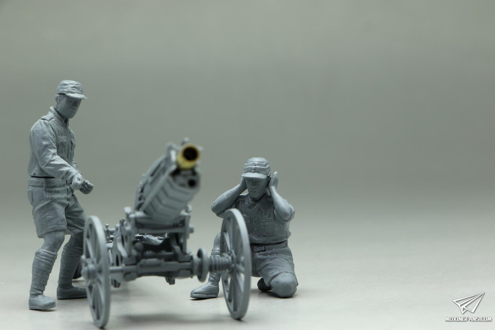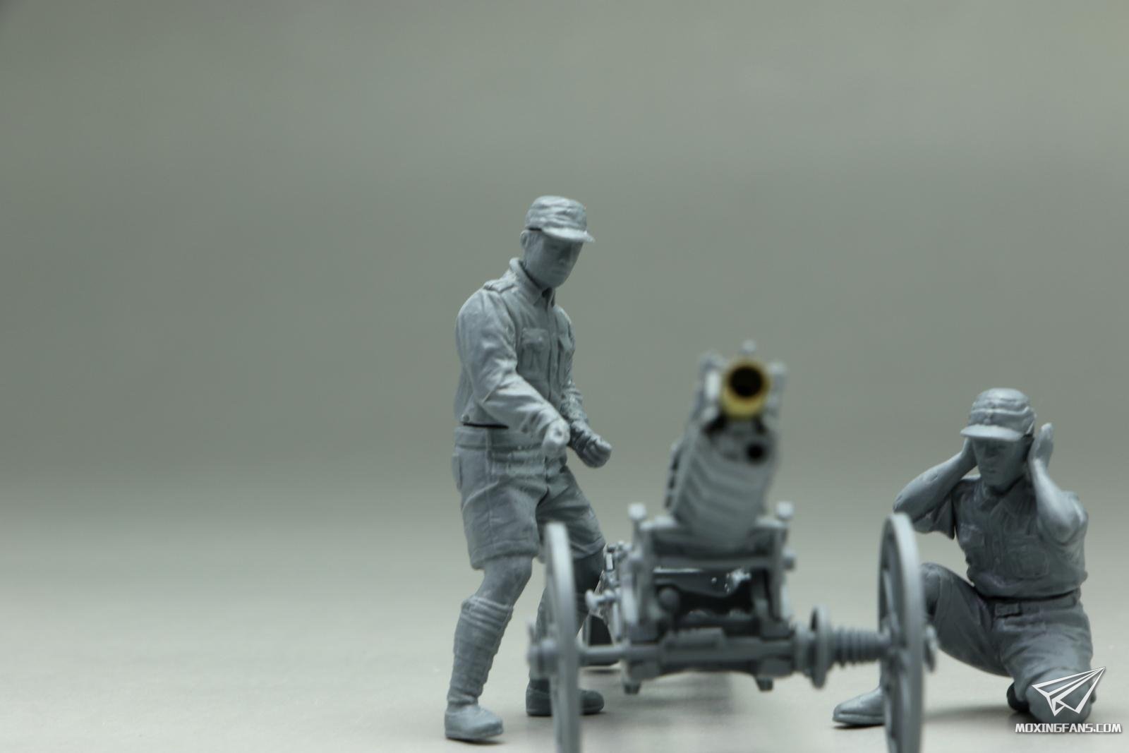 简单测评: 该套件零件不多,组合度好,开模犀利,炮身可俯仰,金属炮口,3D打印件弹药,整体的细节表现较为锐利,合模线也控制的比较好,组合度尚可。说下不足,兵人细节一般,组合度不太好,躯干和四肢接缝较大。