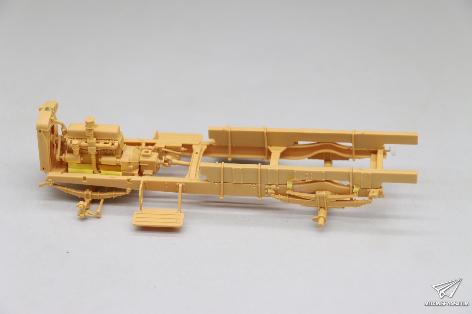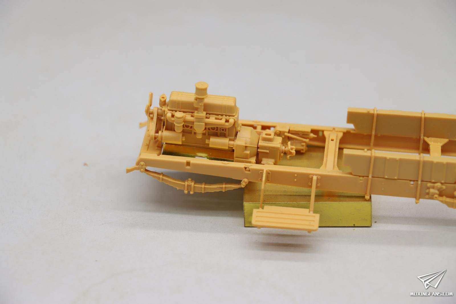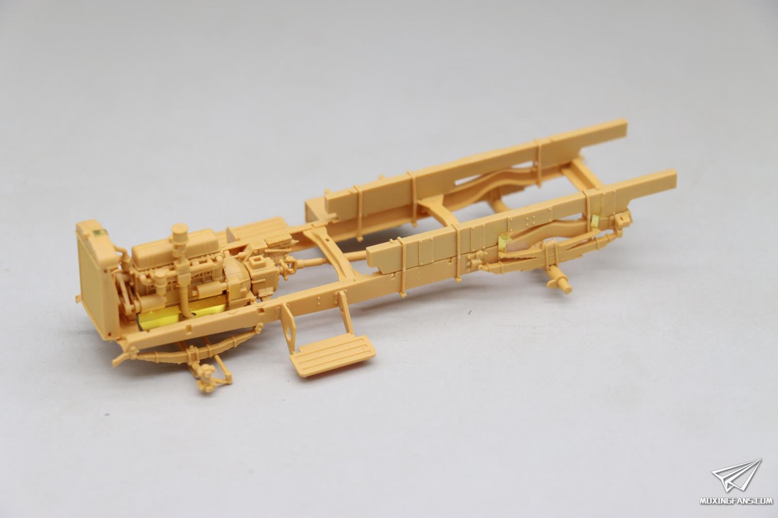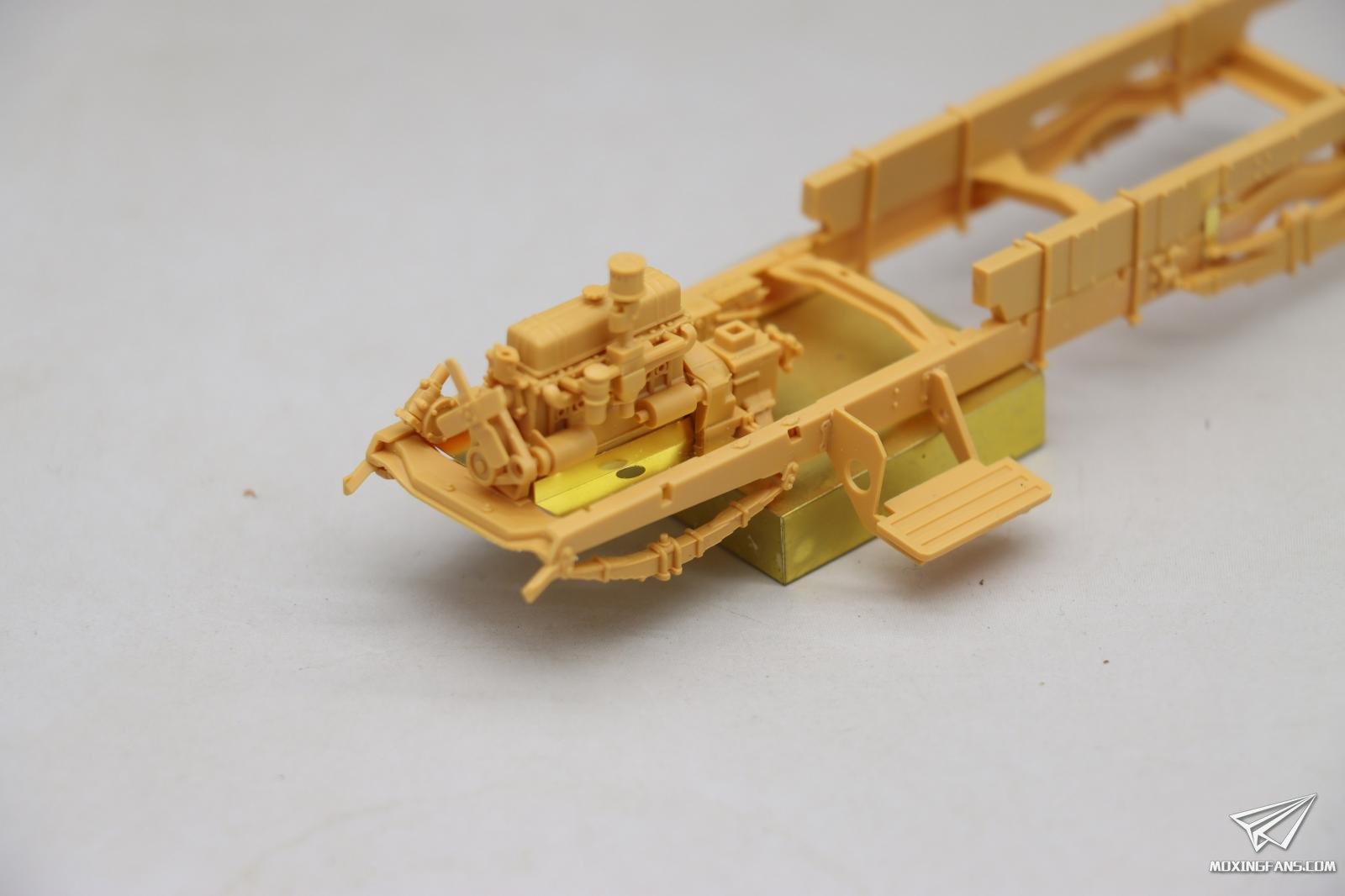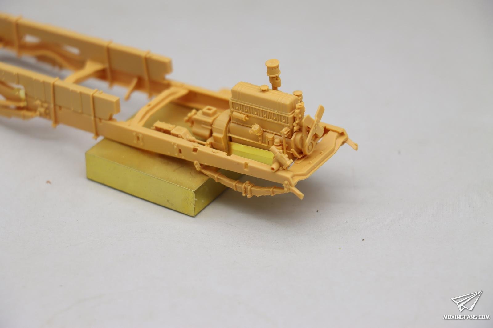 这是我做过最精美的35比例车辆的模型发动机,它的细节非常的丰富,甚至开出来了火花塞的管线线束控制器。玩家如果可以找到合适的考证资料的话,可以很方便的将管线与火花塞控制器连接起来,做出一个更加精美的发动机。同时,这款发动机还可以自行再继续添加一些管线,使它变得更加的逼真。 同时将前部的水冷散热器直接和发动机一块儿组装在一起。注意操作,本来还有一个长条形状的蚀刻片结构件,很不好安装,制作失败了,好在不影响后期安装。在这里需要小心和注意。尽可能的多做一些假组,然后再用瞬间胶去粘合它,而且在粘合的过程当中也要注意再继续调整。