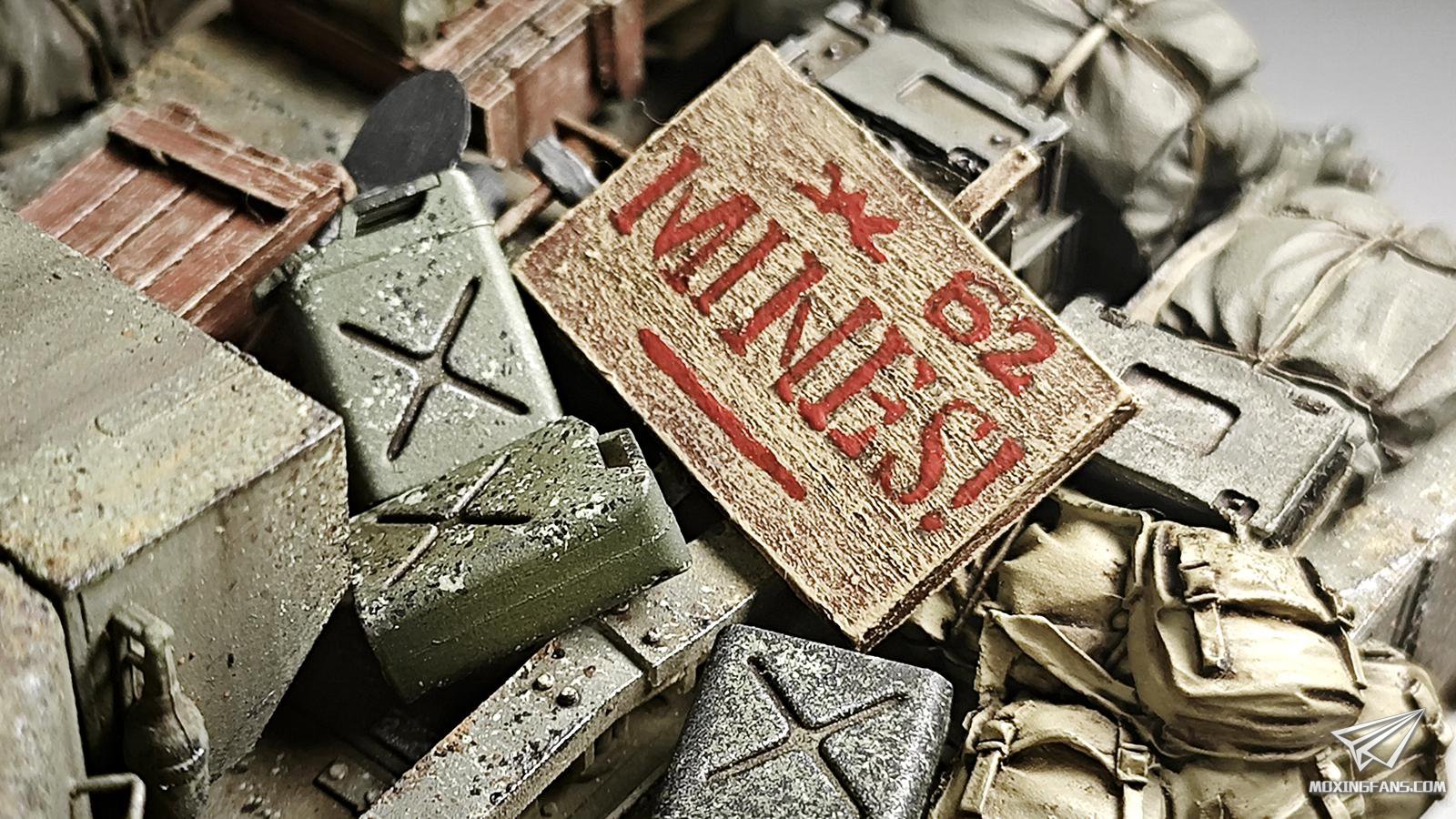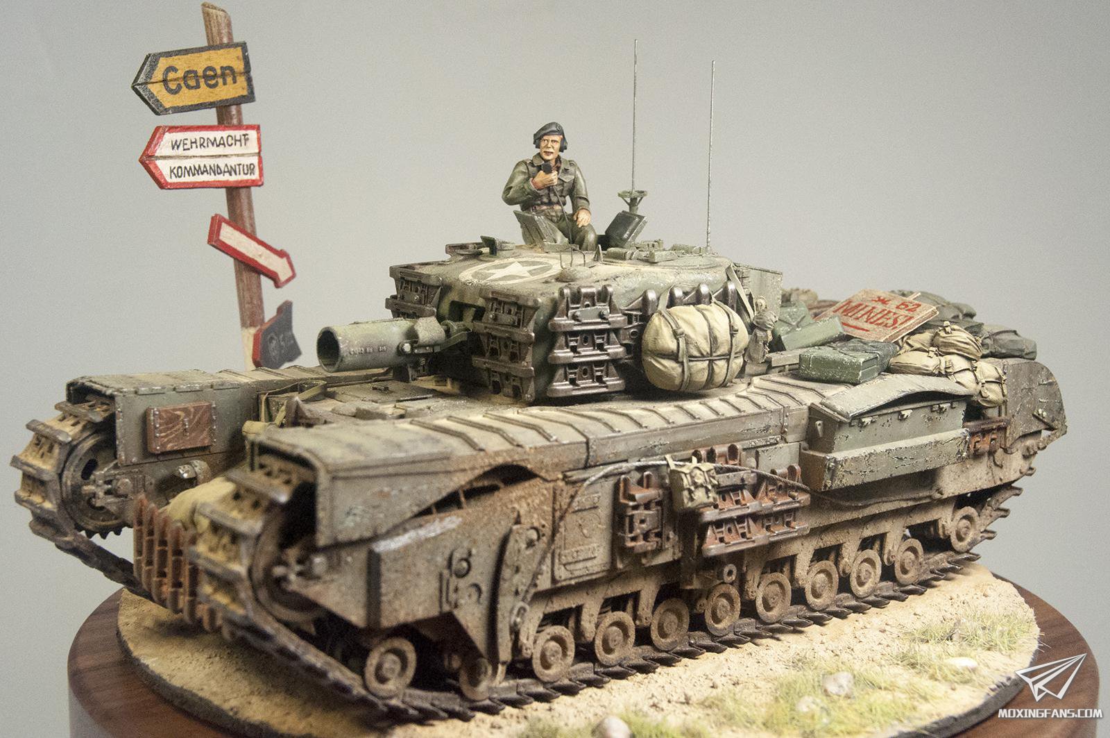 本次模型主题叫——《驰援卡昂》 进攻卡昂的英军受阻,急需重火力支援。一支由丘吉尔AVRE组成的工兵小队,在刚完成诺曼底周边的防御布置后就接到命令,火速前往卡昂前线支援。 模型场景定格于这只小队到达卡昂城区边缘的路标前。套件:AFV35259。