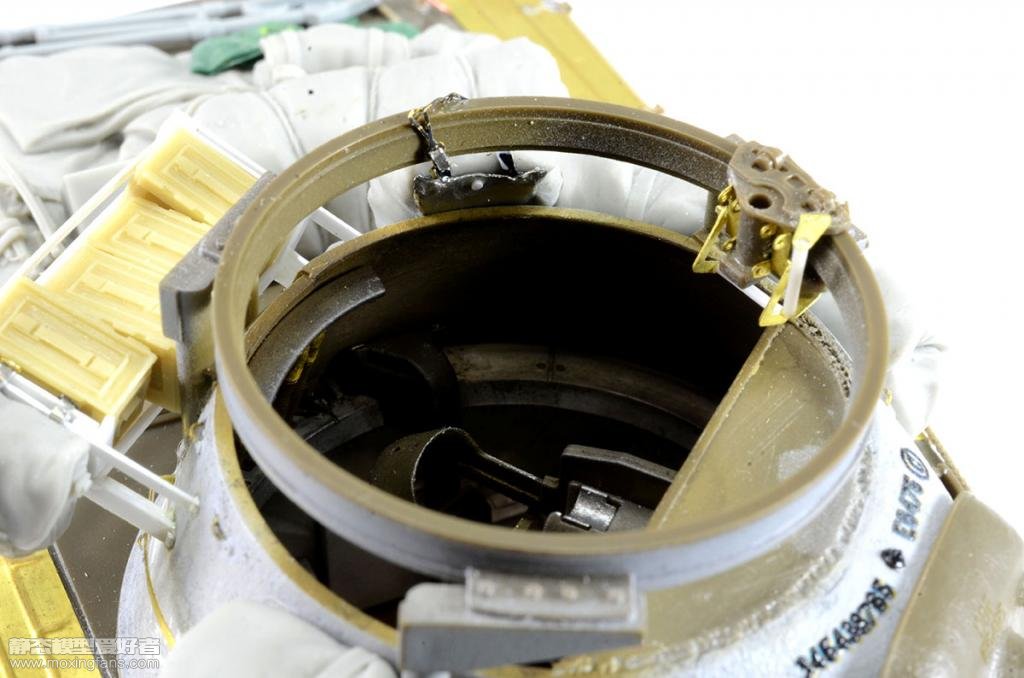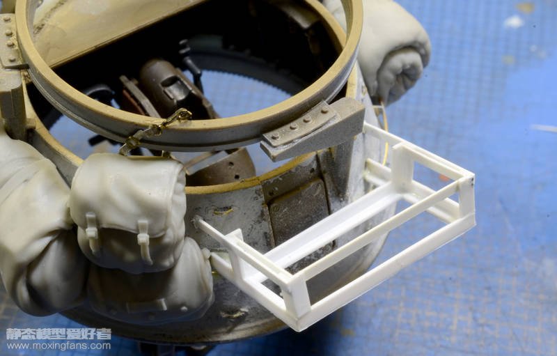 ![]() 这张照片能够清楚看到我添加了Aber的PE的炮塔吊篮和挂包。我使用了铝箔来制作小包,用冲子来制作包上的小按钮。