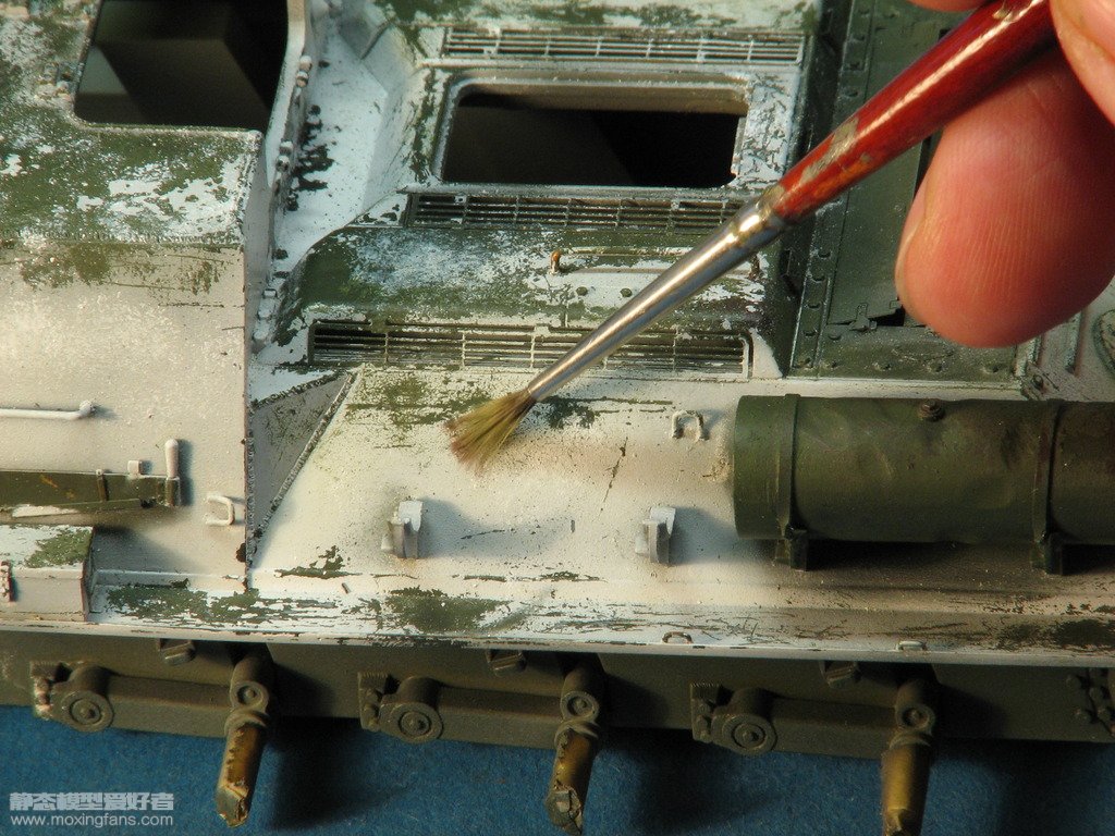 待效果液干燥后用AV漆调出想要得到的高光色,大剂量稀释后喷涂到想要表现高光的部位,干燥后使用水将其洗掉,漏出掉漆后的底色。
