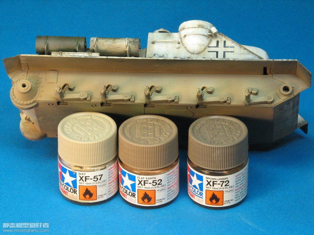 使用油画颜料和效果液在磨损严重的部位制作模拟效果,主要使用干扫的技法。 使用田宫水性漆预制底盘昵图效果。 使用多种颜色调出的天然土混合石膏粉在底盘上涂抹,制作泥土效果。 路轮也是如上炮制,钢制的诱导轮使用石墨粉摩擦制作磨损效果。 将天然土效果液混合石膏粉,用废旧毛笔蘸取后使用喷笔将其喷到需要的位置。 使用引擎漏油效果液制作一些漏油效果。 共 7 页 <1234567>