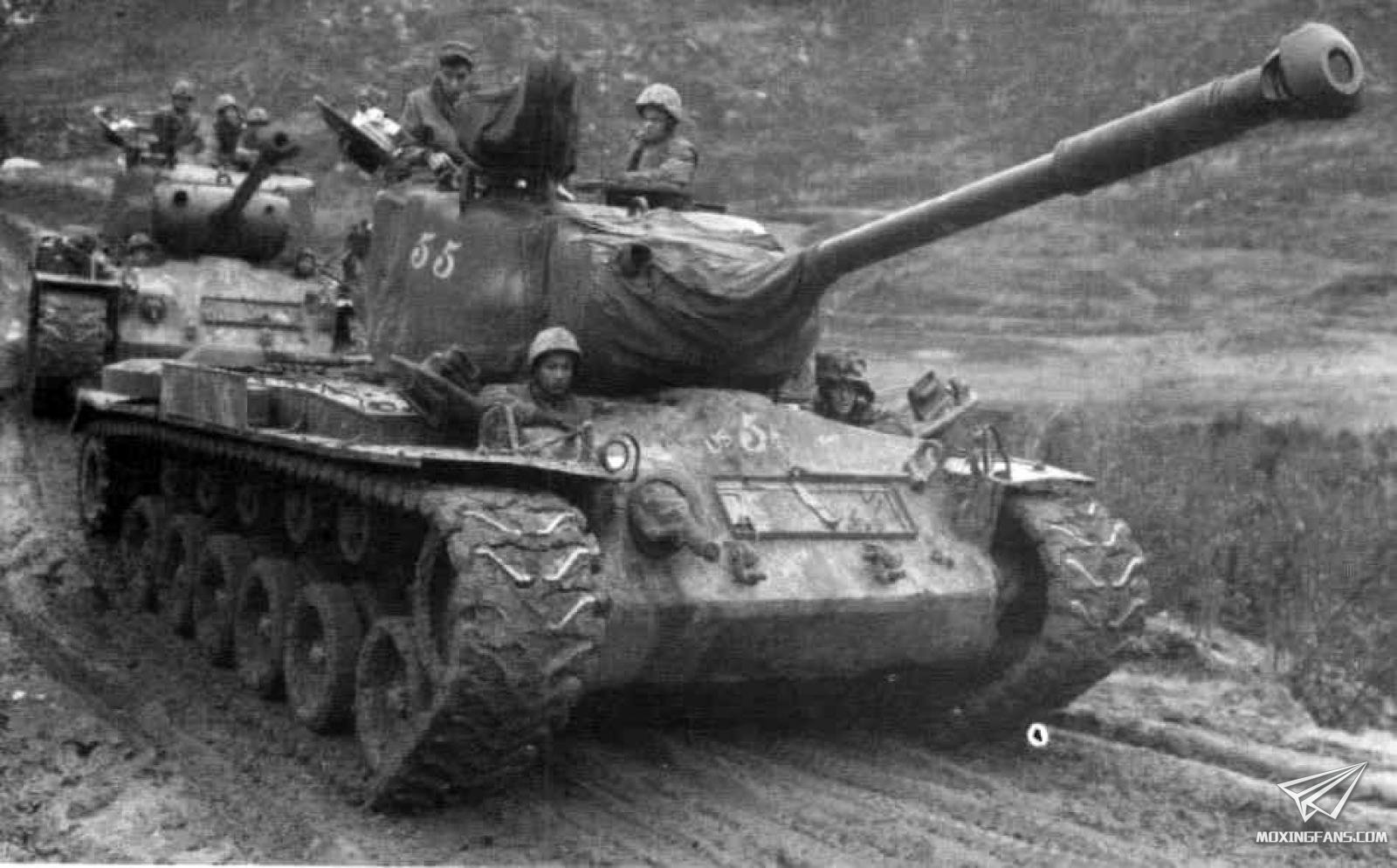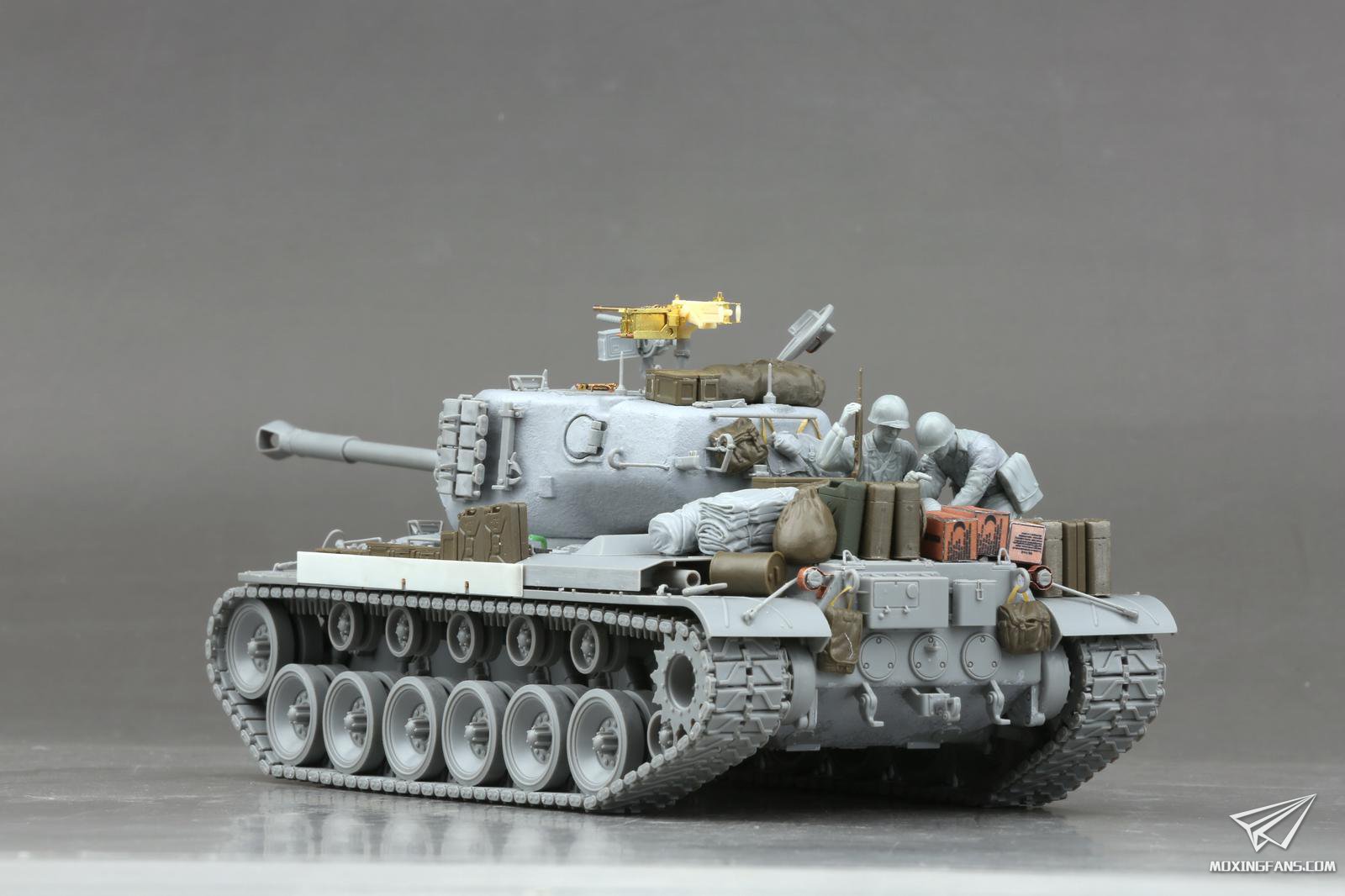 根据历史照片追加M46坦克模型细节,让模型具有陆战队的特征,炮塔上的M2HB 勃朗宁重机枪换为沃雅产品,细节比原件提升不少,车长位置的M1919 .30机枪来自威龙套件,本套件并未提供。装填手舱盖细节全自制,车灯架使用铜皮自制,翼子板两侧根据历史照片追加挡板,行军包,油桶,.30及.50弹夹来自田宫谢尔曼套件。美国海军陆战队兵人来子威龙套件。经过改造后的车子更具陆战队特色。