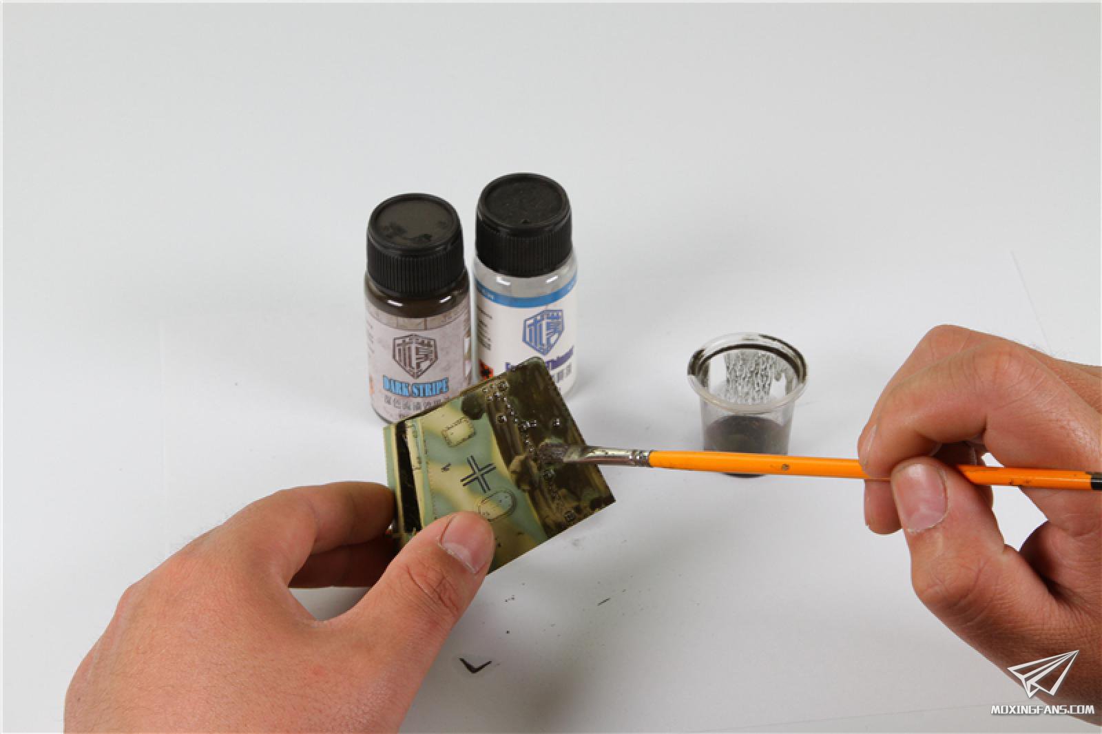 这里我选用深色流渍来渍洗炮塔,首先把渍洗液刷到模型上,等待干燥不反光之后,慢慢把多余的渍洗液擦掉