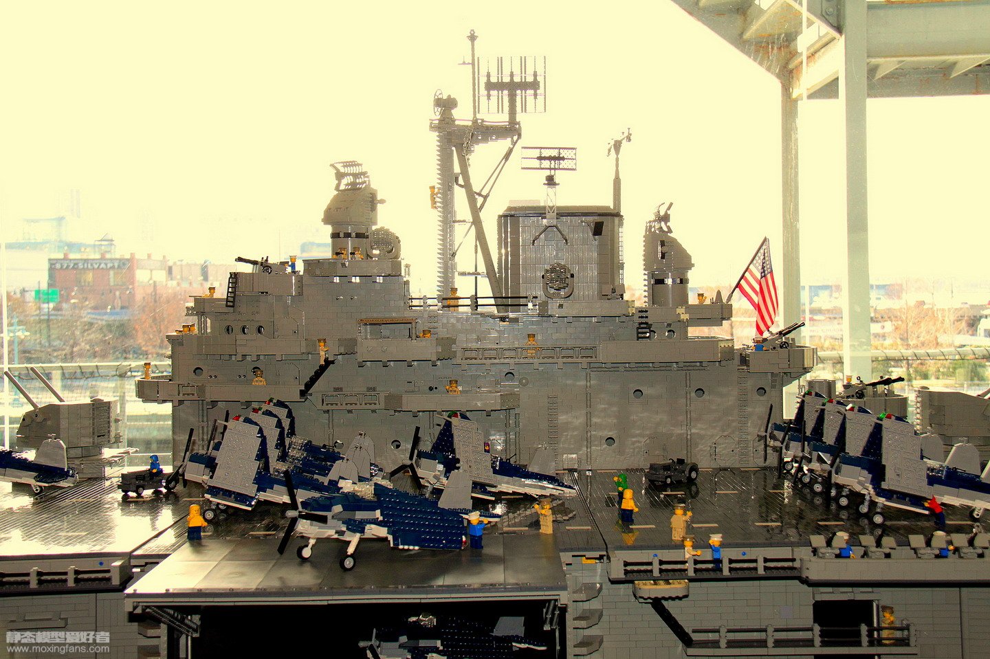 在国外的网站上偶尔看到了这则新闻,英国的一个叫做Ed Diment的小伙子用乐高积木搭了一艘无畏号航母。整艘航母6.7米长(22英尺),1.4米高(4.5英尺),1.4米宽(4.5英尺),227公斤重(500磅),使用了250000块乐高积木,由3个人共同建造,花费了超过9个月的时间。玩乐高玩到这种境界也是醉了,老外真会玩,老外的房子真大,老外9个月不上班还有饭吃。