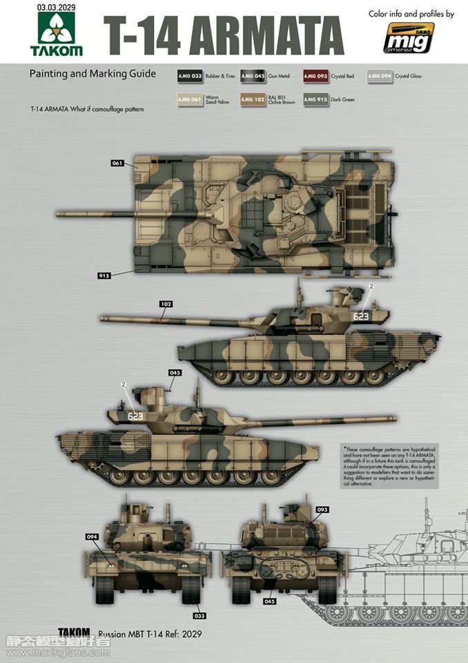 T-14这个题材最近非常火,无人炮塔吸引了无数军迷的眼球。本来以为这种新型装备短期内不会出模型,因为资料未公开,都是秘密状态,但是三花却在第一时间放出了此款T-14阿玛塔模型。从图片上来看这款模型已经上市,请注意图片上的“SELLING NOW”字样,灰色塑料锐利度良好,可动部件很多,并未采用酋长那样的魔术履带,履带齿为单独粘接。涂装方面可选范围也很多,相对于阅兵时的单色迷彩要顺眼不少,但是这辆坦克的比例还是有些不协调。。。