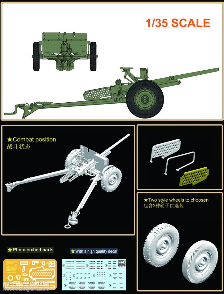 【威骏 CB35147】1/35二战美军m3a1 37mm反坦克炮 这门火炮就是M3/M5轻型坦克上搭载的那门火炮,但是口径仅为37mm的炮不足以对欧洲战场上的德军战车构成威胁,所以这些火炮大部分都用于对付东南亚的日军。 模型特点:可制作成运输状态和战斗状态两种模式可选;两种轮子可选;两种工具箱可选;摇盘细节逼真;套件包含弹药及弹药箱。