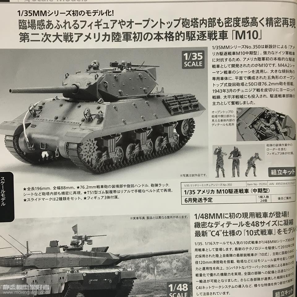 今日在FB上流传着一则新闻,有国外模友在疑似田宫年刊的书籍上面拍到了田宫的一款新品:编号为35350的M10驱逐战车。从照片上的信息来看,这款模型将在2016年6月发售,带有炮塔内构,搭配T51履带,附带3名兵人。目前还不能完全确定此消息的真实性,但是从35350的编号来看,应该是田宫自己的新品,并非包装别家的老货,那样的话还是值得期待的。