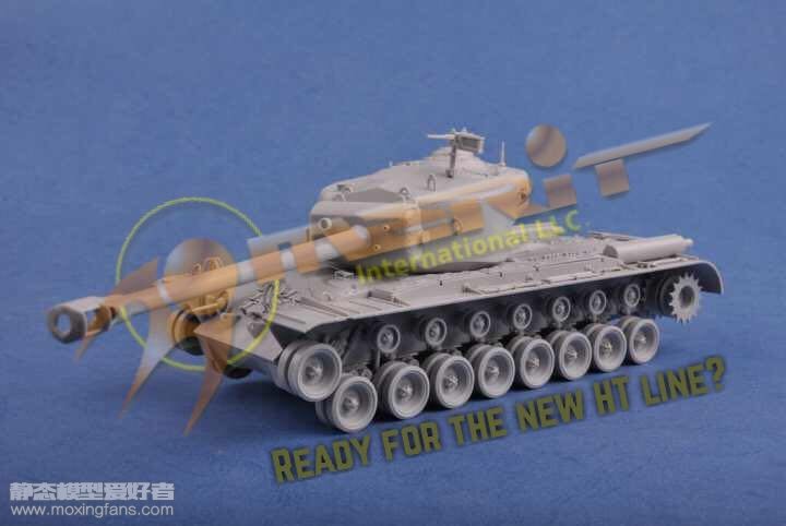 第二款是美系重坦,小号手使用子品牌Merit来推出,应该是新开了T29/T30/T34的科技树。题材方面肯定是瞄准了WOT这块蛋糕,图中的广告词表明了态度:READY FOR THE NEW HT LINE,说明不会是一款,而是整个铁头系列,看来小号手在JS-7和JS-4等苏系重坦身上尝到了甜头,准备在美系铁头上也如法炮制了,洋大人们一片叫好之声。