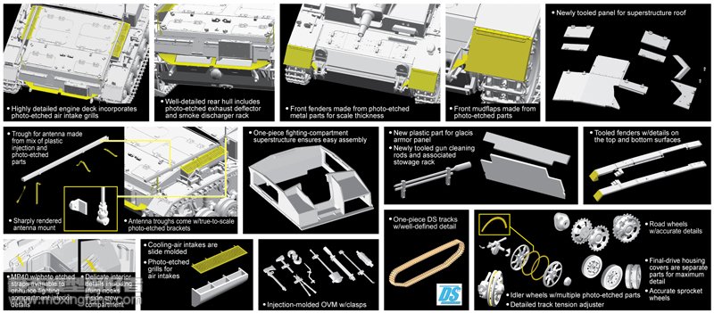 三号突击炮是德国在二战中使用最为广泛的一型战车,最终制造了大约10619辆。三号突击炮基于三号坦克底盘重新设计而成,由于没有可旋转的炮塔,所以制造成本更加低廉,工艺也相对简单,便于大批量制造。三号突击炮E型装备了标志性的75mm stuk37 L/24短管火炮,从1941年9月开始生产,1942年终止,生产数量约272辆。相对于之前的三号突击炮,三号突击炮E型装备了全新设计的叶子板以适应全新的战斗室。三号突击炮E型战斗室右侧有所变更以容纳无线电台,内部结构也有所变化以容纳更多的75mm炮弹。内置的MG34机枪和小型检查舱盖铰链则是三号突击炮E型的另一项特征。 威龙已经在多年前推出了许多出色的1/35比例三号突击炮模型,但是并未推出新开模的E型,此次的三号突击炮E型是日本设计师和威龙团队合作的结晶。(Dragon is now redressing this gap by offering a brand new kit of the Ausf.E, which is designed by Japanese designers and Dragon team.)。这盒三号突击炮有着许多新开模零件,诸如战斗室,车灯,stuk37短管炮,战斗室地板,正面装甲和火炮清洁杆等等。 小编:在威骏放出三突E的卫星之后,威龙果断回应了,SK版三秃子还是有点意思的。不过封绘都没画完就端上桌了,看来威龙也是够急的。