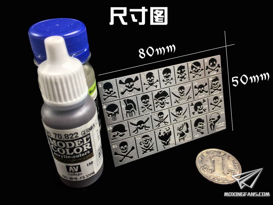 艾烈臣今天推出的第二款新品就是这件1/35比例和1/100比例的高达/机甲/军模骷髅死神海盗旗标识陆军漏喷。小编是个军模党,看到这个骷髅漏喷第一个想法就是用在中东地区的皮卡和M1上面,喷上这个骷髅图案一定很酷。小编能想到的另一个用处就是1/35比例休伊直升机机头的标识,骚年们还记得《现代战争启示录》当中美军中校的那架呼啸而过的休伊直升机吗?