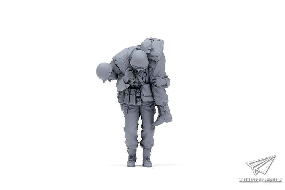 树脂材质的模型具有塑料射出材质无法比拟的细节,它既能还原布料的褶皱,也能捕捉人体肌肉的细微变化。对于每一位模型玩家而言,制作精良的树脂模型都是不可多得的佳品。而树脂人形更是以其远超塑料模型的表现力成为人像制作大师们的最佳选择。 MENG的两款树脂人形均为职业原型师手工雕塑原型。HS-008r钢锯岭取材于二战时期太平洋战场美国陆军的卫生兵。荣誉勋章获得者戴斯蒙德·多斯(Desmond Doss)的事迹通过好莱坞电影而家喻户晓,这款产品包含一名美军伤员,和一名背负伤员的卫生兵。HS-009r则取材于一张拍摄于二战西欧战场的真实照片,被俘德军的无奈和英国伞兵的得意神情相映成趣。这两款树脂兵人动作自然,表情生动,相信通过爱好者的涂装,二人不同的思绪能够得到更生动的表达。