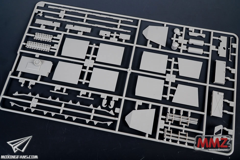 田宫在前不久的静冈展上展示的这款后期型灰熊吸引了很多模友的目光,作为一款田宫全新开模的市面罕有的后期型灰熊,这款模型的吸引力还是不小的。目前这款模型还未上市,韩国的MMZ网站第一时间拿到了这款模型的试模件,并且将板件信息发布到了网站上,下面我们就一起来大体看一下这款灰熊如何。 ▼ 和量产版本的套件不同,试模件的塑料颜色为灰色。首先就是全新开模的上车体和战斗室,使用了滑块开模技术,战斗室顶部装甲单独开出,叶子板上面开出了侧裙板的支撑。