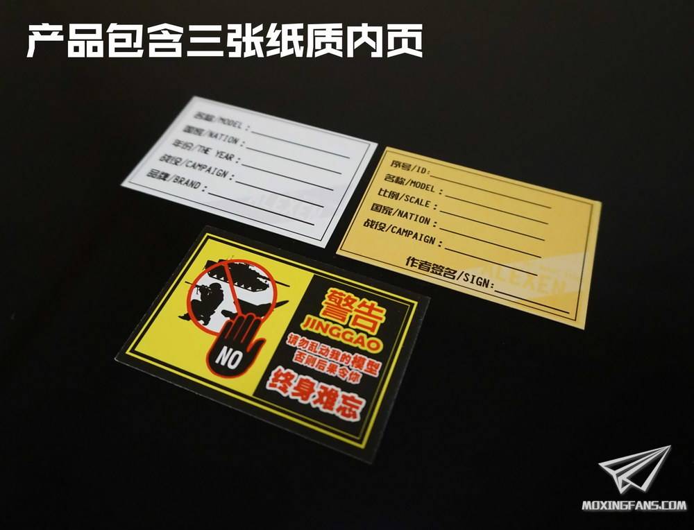 之前一直有些老一辈的人或者不懂模型的人来新家,见到展柜里一堆模型,东问西问,偶尔还说“人都那么大了还玩玩具啊”,心里一千个***奔腾而过。。。 而且特别是人多的时候,根本不想搭理多几句。 后来也习惯了介绍,特别是军模,偶尔会吹吹水,介绍一下虎式早中期型的区别和虎式王牌的历史,还好我是结婚人士,不然真心会被人认为是单身狗。 再接着,我就想直接把模型的型号、历史、年份、战役的内容标上去,介绍的时候也好介绍,没时间的时候也可以让他们自己看看浏览,我差点就把模型的天价给标上去了。 于是乎,就有了这款产品,艾烈臣的CR004。 产品含亚克力本体一个,三张纸质卡,一张是家用的,一张的展览用的,带签名处,还有一张是防熊孩子图案的警示图,用来吓唬熊孩子。 对这个展示牌自己还是比较满意,一拿到手就把全家上下所有的模型给标上名称,发现在写名称、战役过程中,也是在回味历史和制作过程,对模型有了更多的珍重,估计这就是罗辑思维的所谓的“互训”吧。 12元,一顿麦当当的早餐的价,就能让模型标注上意义,让模型标注上历史,让模型拥有名字。 ----还能帮你减肥。。。。。 小编:以上文案均出自艾烈臣官方,写的挺好,很有煽动性。现在的模型厂家比以前要灵活了许多,市场需要什么,厂家就能提供什么,这个趋势挺不错。