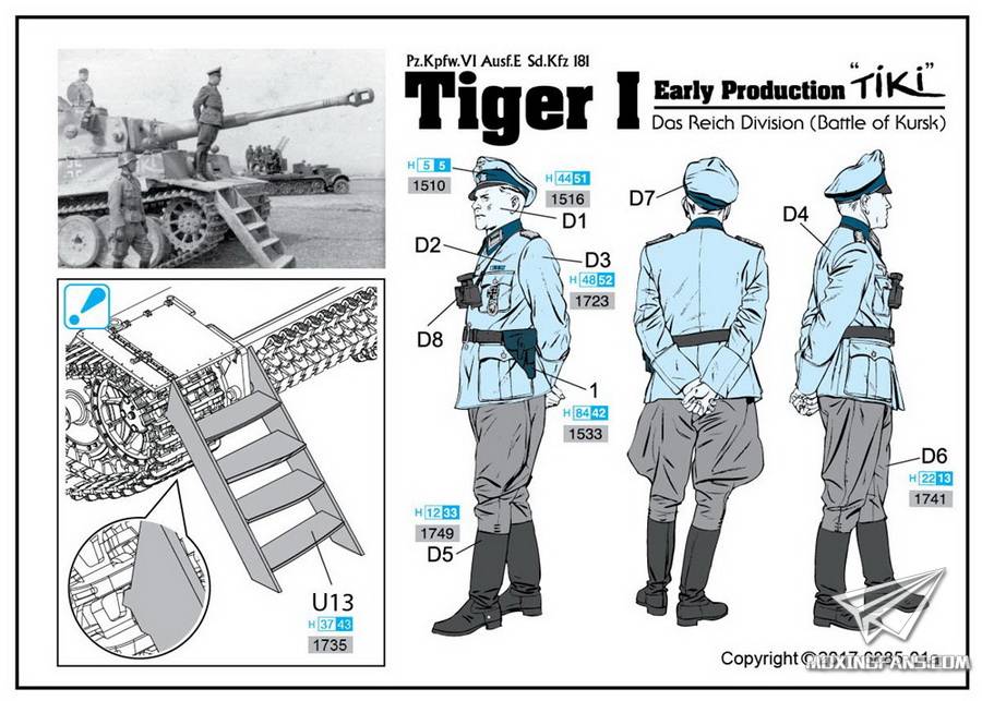 二战时期法西斯德国的党卫军帝国师作为党卫军最早组建的师级部队参加了白色方案,黄色方案,巴巴罗萨计划,台风行动,哈尔科夫战役,库尔斯克战役,阿登反击战和维也纳战役等著名的战役,是武装党卫队表现最出众的王牌部队之一。1942年11月13日党卫队指挥总局签发了Tgb.Nr.7288/42号密令,为帝国师的装甲团组建一个重装甲连,部队番号为党卫军帝国师装甲团第8连。该连有一辆战术标号为833的虎I初期型坦克在车体正面和侧面书写着“TiKi”字样(车组成员女友姓名Theresa Katrin的缩写昵称),由于在哈尔科夫会战损失了不少坦克,因此部队车辆的战术编号进行了大幅度调整,这辆833号虎I被改编成812号,于同年被摧毁在库尔斯克战役只留下少数几张极其珍贵的历史照片。 这款岁末贺新的1/35虎I初期型重型坦克“TiKi”帝国师样式新品采用SmartKit精密版的规格进行板件设计,为保证套件的高品质属性我们邀请了著名的虎式坦克研究专家David Byrden作为设计指导(曾参与过NO.6820,NO.6608,NO.6850等多款经典虎I题材套件产品的监修工作),使这辆初期型“TiKi”的模型在外形尺寸和细节结构方面得到了最为权威的实物考证数据资料参考。在原有虎I初期型的车体框架基础上作了细致详细的设计修正并加入了包括套盾、炮塔背面储物仓、备用履带支架以及车载用具在内的许多新开模专用零件和增加局部细节表现力的PE金属蚀刻片。提供了能够对应四种不同涂装需要的水贴纸。备受关注的履带部分此次国内版采用了一体成型式DS履带+MagicTrack魔术履带的双履带形式以满足广大“爬虫”迷们的制作需要,而且还额外附送一板帝国师军官的兵人板件用以还原和便于制作帝国师师长克吕格中将在1943年4月20日哈尔科夫会战胜利纪念会上登上阶梯站在“TiKi”上向部队发表演说的历史场景(日版提供DS履带和兵人,但不提供魔术履带)。